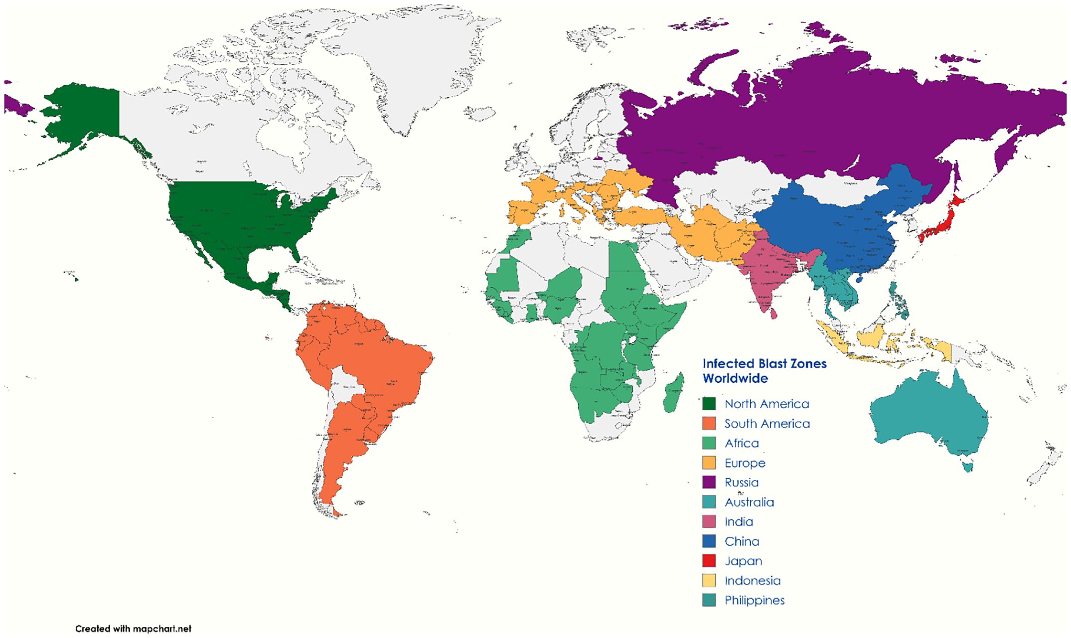 Rice production in West Africa, the world’s largest rice producer, is severely affected by blast disease, causing yield losses of 3%–77% (Shahriar et al., 2020). This disease, also referred to as rice seedling blight (Zeigler et al., 1994) and rice rotten neck (Talbot, 2003), was first documented as “rice fever” in China in 1637 and later as Imochi-byo in Japan in 1704. It gained global recognition with Italy experiencing its first epidemic in 1828 and the Tanjore delta in India identifying it in 1919. Currently, the disease impacts approximately 85 countries worldwide, particularly in South Asia and Africa (Wang et al., 2017), with annual yield losses ranging from 10% to 80% (Simkhada and Thapa, 2022). These losses are influenced by various factors such as varietal susceptibility, infection severity, fungicide application timing, high humidity, drought, heavy dew, elevated mean temperatures, high plant density, and excessive nitrogen fertilizer use. In India, rice blast epidemics can result in yield losses of up to 50%. During natural epidemics in the wet season, disease incidence ranges from 14% to 27% (exceeding the economic threshold), leading to yield losses of about 27%–35%. Severe epidemics occurred between 1980 and 1987 in several Indian states, such as Himachal Pradesh, Andhra Pradesh, Tamil Nadu, and Haryana, causing substantial financial losses. It is estimated that the annual yield reduction due to rice blast disease could feed approximately 60 million people each year. In the United States, Arkansas, Louisiana, and Mississippi are the most affected states, with yield losses ranging from 6% to 50% and an average annual loss of USD 69.34 million due to blast. The disease is also a significant concern in European countries like Italy, Spain, Portugal, Greece, and France, where it has been observed to reduce the milling yield by 20% to 50% (Devanna et al., 2022) (Figure 1).