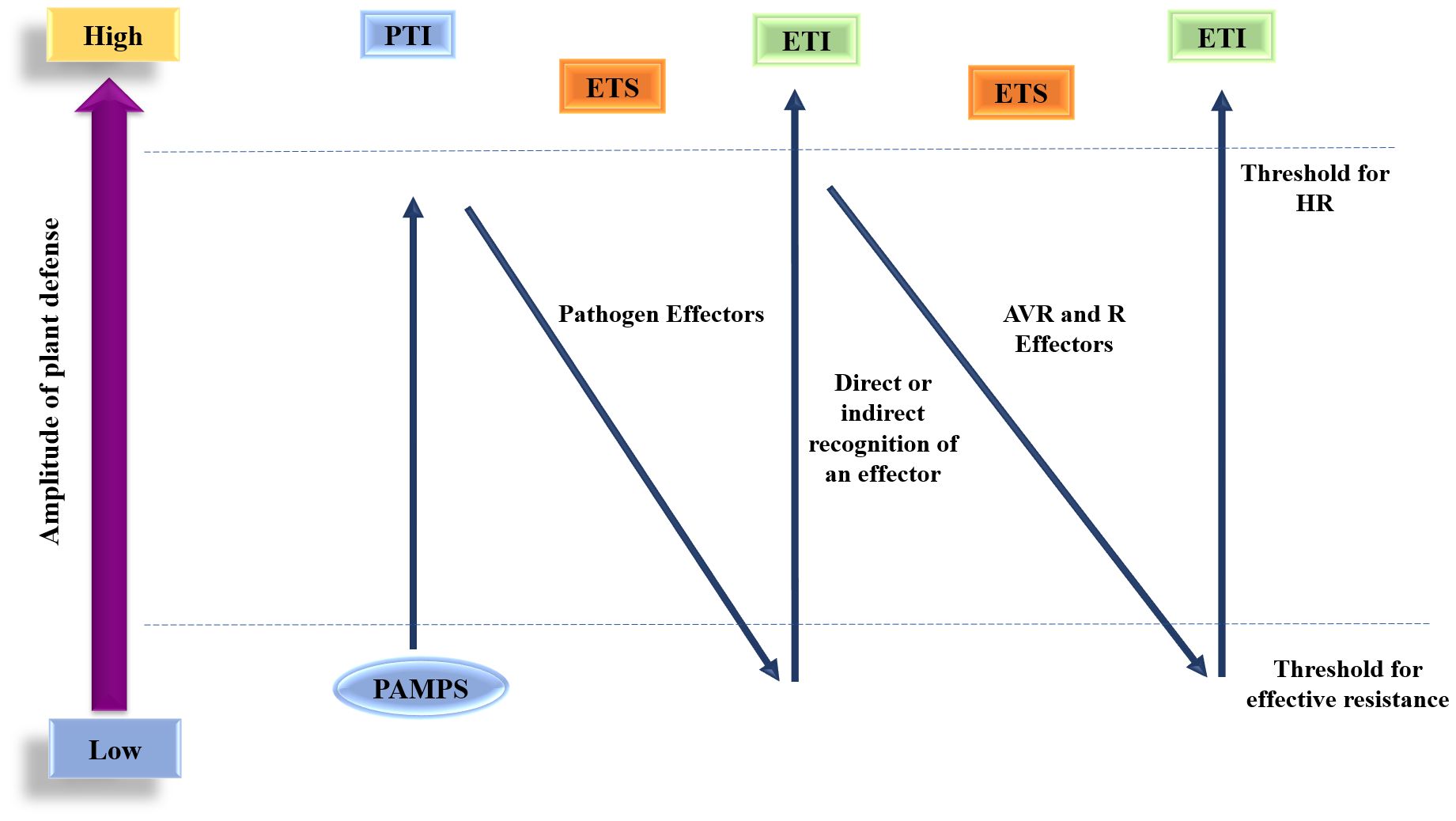 The zig-zag model, initially proposed by Jones and Dangl in 2006, describes how the recognition of PAMPs initiates primary defense mechanisms based on PTI, which help to reduce pathogen growth, though they do not completely eliminate it. Pathogens that flourish have developed effector or virulence factors that promote their growth by suppressing PTI, resulting in effector-triggered susceptibility (ETS). In response to certain pathogen effectors, plants have developed ETI, primarily by recognizing altered self-products from ETS via NB-LRR. This continuous evolutionary battle between host and pathogen manifests in repeating cycles of ETS and subsequent ETI. The outcome of the plant-pathogen interaction is influenced by the sum of ([PTI − ETS] + ETI) (Figure 3).