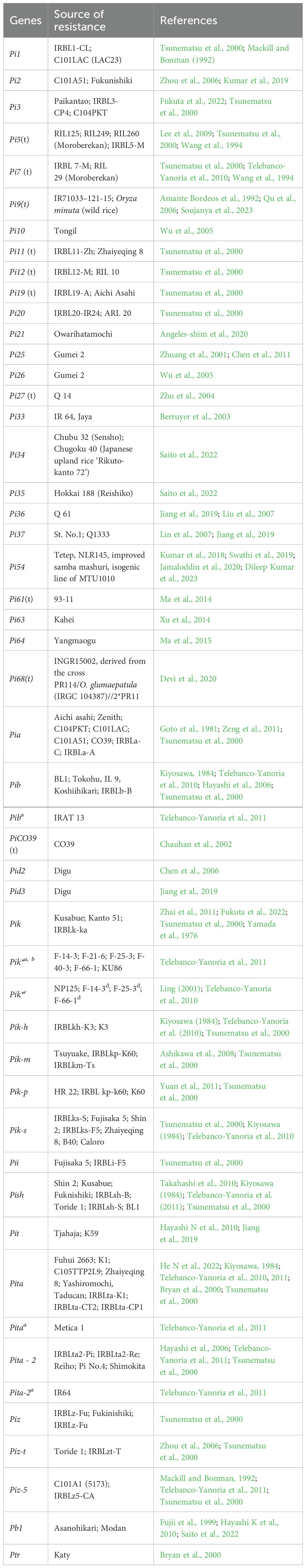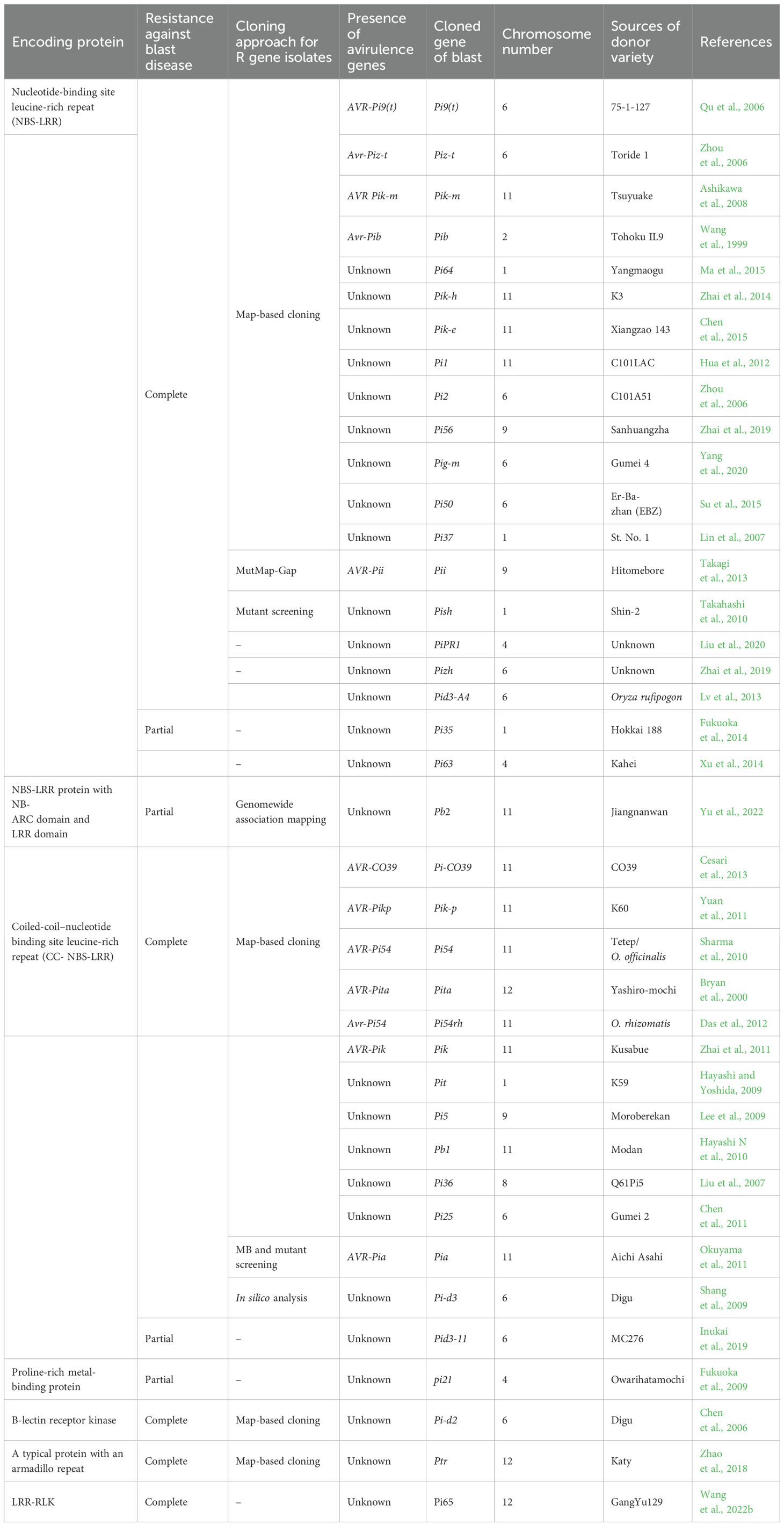 Analysis of rice germplasm with different races reveals complete resistance conferred by significant blast resistance (R) gene. However, the resistance may be broken down due to its single R gene locus having race-specific characteristics. Because of the progress in molecular marker development and functional genomics, blast resistance genetics in rice have been strengthened (Qian et al., 2023). R genes serve as the cornerstone of disease resistance. To date, 146 resistance genes of the blast have been identified; among them, 41 of these genes (Pib, Pit, Pish, Pita, Pi54, Pi-d2, Ptr, Pi9(t), Pia, Pi- C039, Pi65, Pi2, Piz-t, Piz-h, Pig-m, Pi50, Pi36, Pi37, Pik-h, Pik-m, Pi1, Pik-e, Pi56, Pi-d3, Pi25, pi21, Pb1, Pi5(t), Pii, Pik, Pid3A4, Pi35, PiPR1, Pi64, Pik-p, Pi63, Pid3-11, Pb2, Ptr, and Pi54-rh) have been cloned and functionally authenticated (Sahu et al., 2022; Younas et al., 2023). Among the array of identified resistance genes against blast disease, Pi54 and Pi2 are highly effective and provide broad-spectrum resistance (Aleena et al., 2023). The genetic analysis, mapping, and cloning of rice blast resistance have been extensively explored since the discovery of three independently inherited R genes, namely, Pia, Pii, and Pik, during the 1960s. R genes are distributed across 11 chromosomes of the rice genome, with a notable clustering on chromosomes 6, 11, and 12, representing 18%, 25%, and 21%, respectively (Ashkani et al., 2016). Since the cloning of the first R gene, Pib, 41 R genes have been successfully identified (Table 2). Except for pi21, which acts as a recessive R gene, the remaining 37 R genes exhibit dominance. All of the genes, excluding pi21, Pi35, Pi63, Pb1, and Pid3-I1, confer complete resistance. Pi-d2 encodes a B-lectin kinase domain protein (Chen et al., 2006), while pi21 encodes a proline-rich protein with a heavy metal domain (Fukuoka et al., 2012), and Ptr encodes an atypical protein with an armadillo repeat (Zhao et al., 2018); the remaining genes encode nucleotide-binding site leucine-rich repeat (NBS-LRR) domain proteins. Several R genes, including Pik, Pikm, Pik-p, Pi1, Pike, Pi5(t), Pia, and Pi-CO39, contain two NBS-LRR protein structural genes for blast resistance (Cesari et al., 2013). The Pi5-1, Pb1, pi21, and Pi63 genes are induced by pathogen infection, whereas the remaining genes are constitutively expressed. Most cloned R genes confer resistance against leaf blast at the seedling stage, while only a few, such as Pb1, Pi25, and Pi64, provide resistance to panicle blast (Cao et al., 2019).