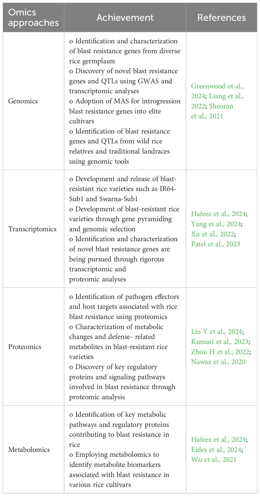 Generally, omics approaches, including genomics, transcriptomics, proteomics, and metabolomics, have drastically revolutionized the study of blast resistance in rice by providing comprehensive insights into the genetic and molecular mechanisms underlying host–pathogen interactions (Greenwood et al., 2024) (Table 6). Genomic studies have identified key genes and genomic regions associated with blast resistance in rice. Genome-wide association studies (GWASs), quantitative trait loci (QTLs) mapping, and comparative genomics are often used to identify candidate genes and alleles conferring resistance (Wei et al., 2021). High-throughput genotyping techniques such as SNP arrays and next-generation sequencing facilitate the identification of genetic markers associated with resistance traits. Genome-wide association studies (GWASs) have been utilized to identify natural allelic variations associated with blast resistance across diverse rice germplasms, offering valuable insights into the genetic framework governing resistance (Abhijith et al., 2022). Genomic selection (GS) leverages genome-wide marker information to predict the breeding value for blast resistance in rice breeding programs. It enables the early selection of superior genotypes based on genomic estimated breeding values (GEBVs) for crop improvement (Tabassum et al., 2021). Transcriptomic studies have provided dynamic gene expression changes against rice blast infection. RNA sequencing (RNA-seq) and microarray analysis have been used to profile gene expression patterns during different stages of infection and in response to various pathogens (Zhu et al., 2024) and are also helpful in identifying differentially expressed genes involved in defense signaling, pathogen recognition, and secondary metabolite biosynthesis, providing insights into the molecular basis of rice defense mechanisms against blast disease (Chandrakanth et al., 2024). Transcriptomics facilitates identifying and characterizing transcription factors (TFs) and regulatory elements involved in blast resistance. TFs such as WRKY, NAC, and bZIP families are key regulators of defense gene expression and play crucial roles in coordinating immune responses (Thapa et al., 2024).