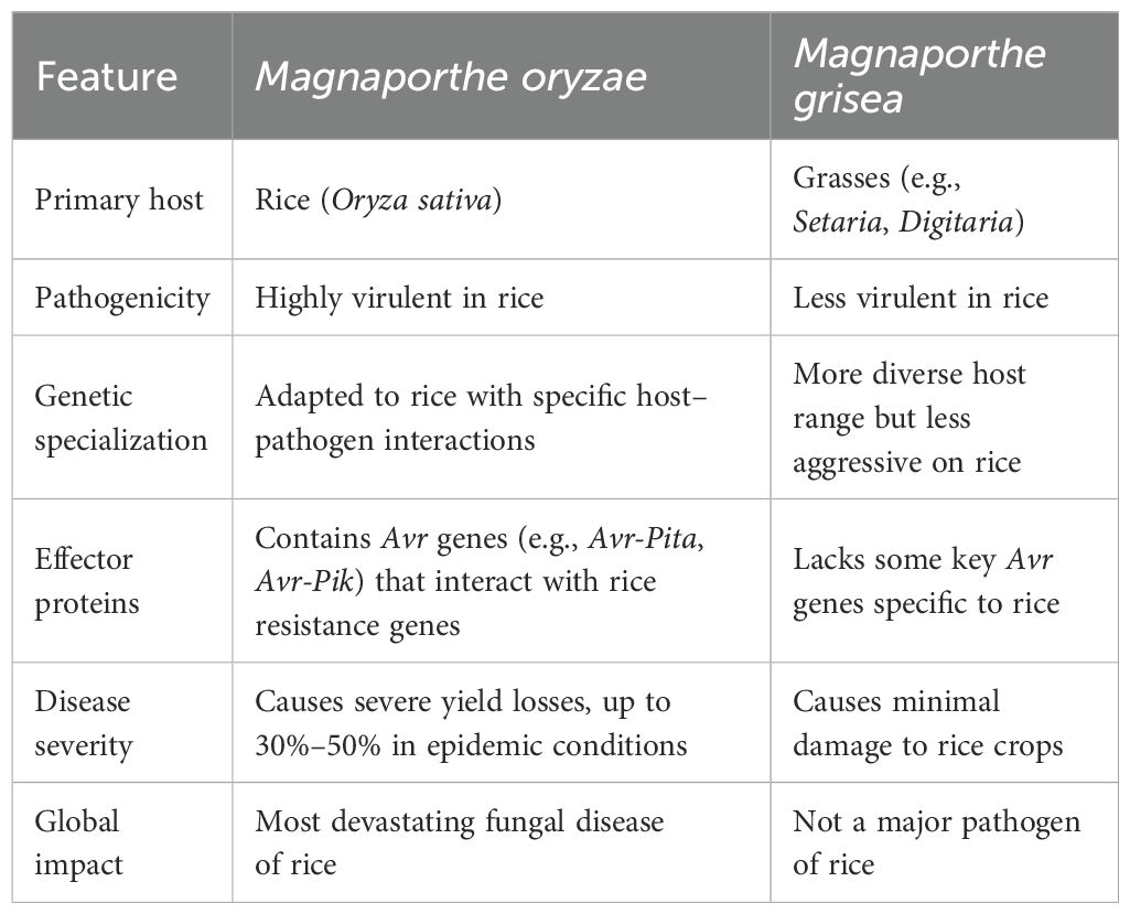Magnaporthe oryzae and Magnaporthe grisea are closely related fungal pathogens known to cause rice blast disease. However, M. oryzae is considered the primary and more aggressive pathogen responsible for rice blast, whereas M. grisea is generally associated with other grasses and is less effective in infecting rice (Choi et al., 2013). Their pathogenicity and host specificity differ significantly.