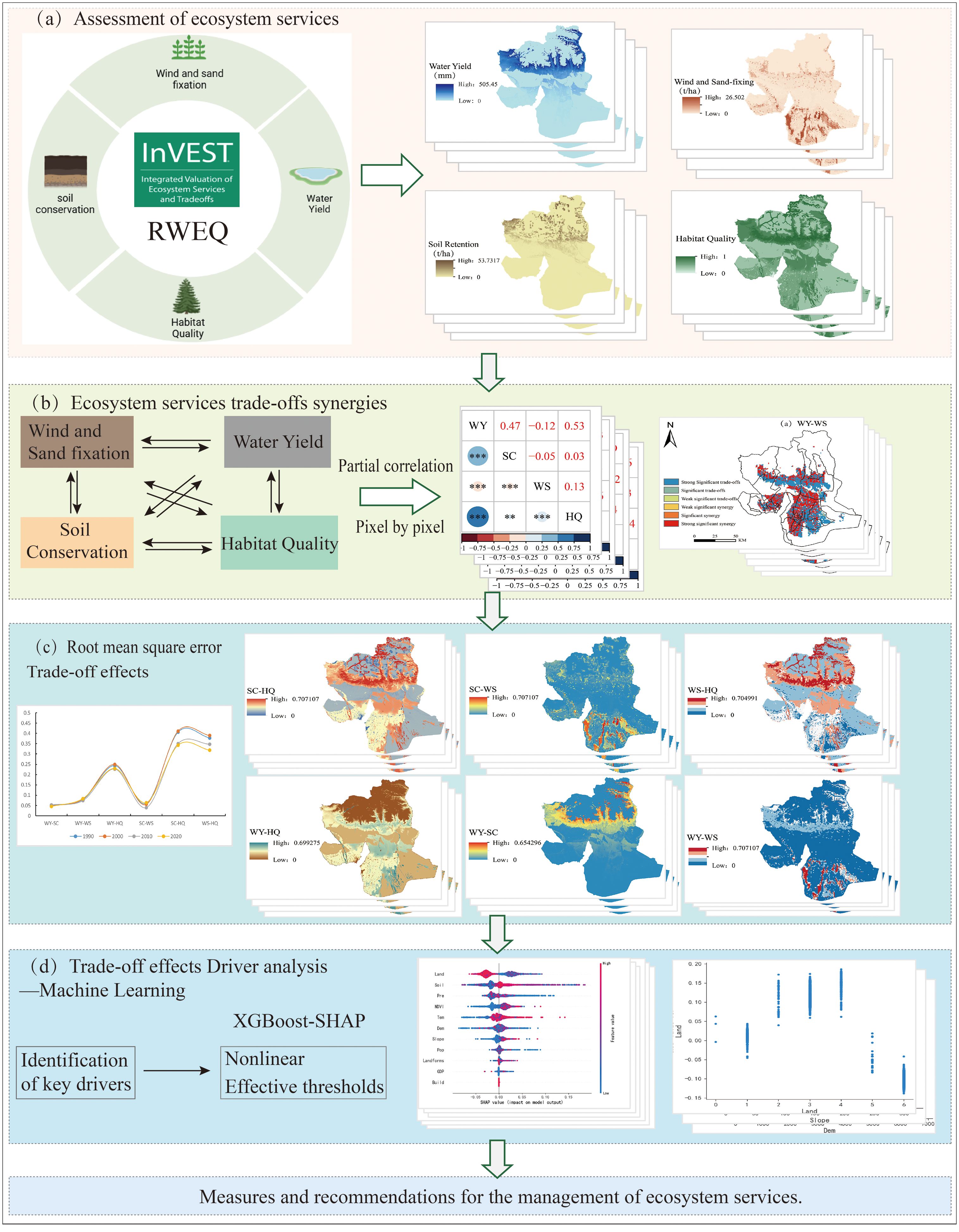 Figure 2. Technical process. (a) Assessment of ESs, (b) ESs trade-offs synergies, (c) Root mean square error trade-off effects, (d) Trade-off effects driver analysis - machine learning.