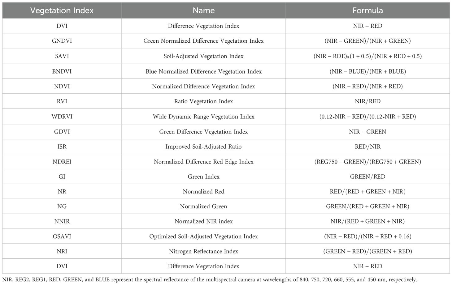 Studies have shown a significant correlation between VIs, PNC of crop, and biomass. By linearly or non-linearly combining spectral reflectance from different characteristic bands, VIs can be used to invert various vegetation parameters and diagnose vegetation growth status (Ma et al., 2022). In this study, multispectral UAV data is combined with existing PNC inversion research to select six spectral band reflectances and 17 VIs for the inversion of nitrogen content in the maize canopy. The calculation formulas for the VIs are shown in Table 3, and these indices will be used as input variables for the nitrogen estimation model in subsequent analysis.