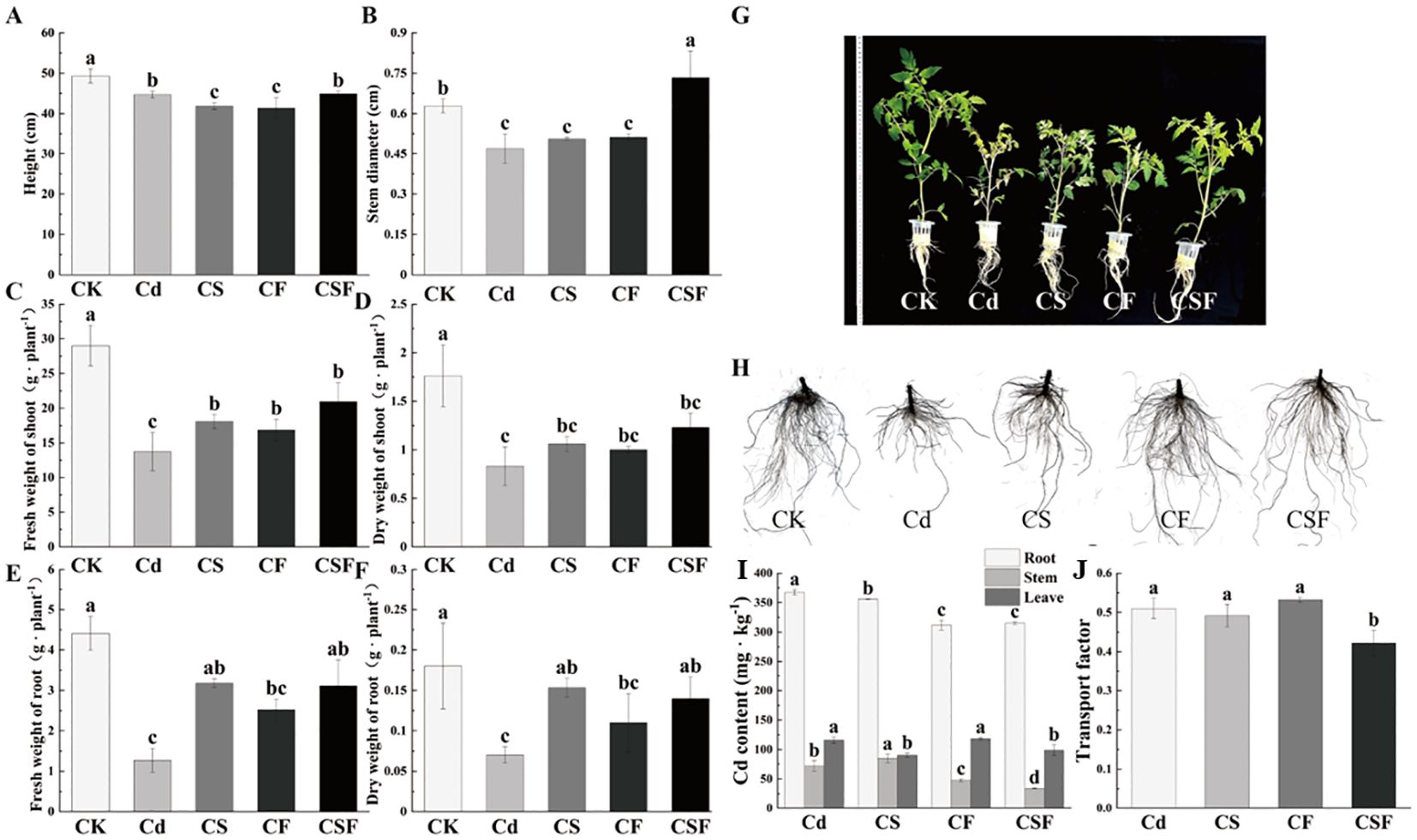 Figure 1. Different treatments on growth indicators and Cd content in tomato seedlings. CF: Cd stress and EDTA-Fe treatment (root application). CS: Cd stress and Si treatment (leaf application). CSF: Cd stress, EDTA-Fe treatment (root application) and Si treatment (leaf application). (A) Plant height, (B) stem diameter, (C) fresh weight of shoot, (D) dry weight of shoot, (E) fresh weight of root, (F) dry weight of shoot, (G) plant phenotypes, (H) plant root, (I) Cd content, and (J) transport factor. Different letters (a–c) on the bar plots indicate significant difference at p < 0.05 using S-W normal distribution (p > 0.05), one-way analysis of variance with Duncan’s multiple-range test.