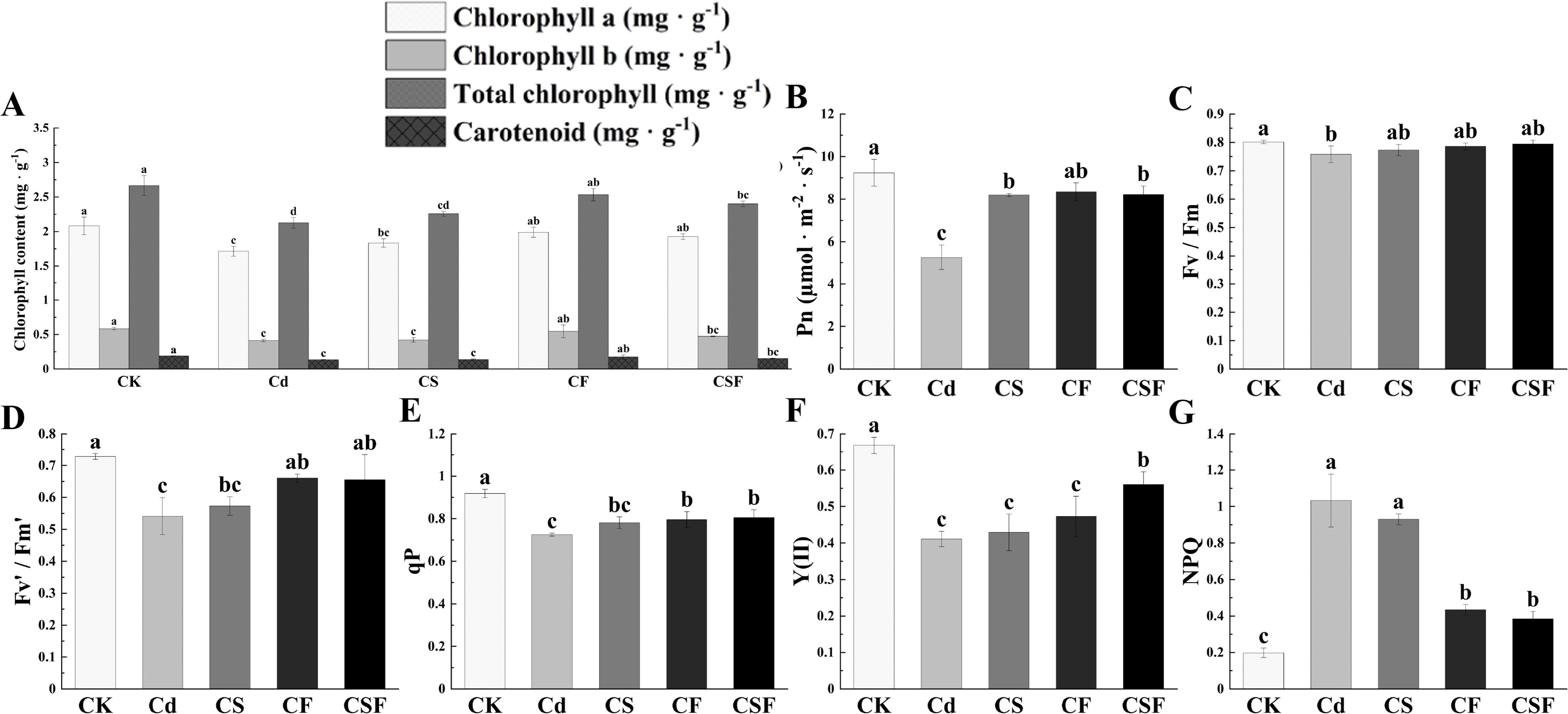 Figure 2. Different treatments on chlorophyll levels and chlorophyll fluorescence parameters in tomato seedlings. (A) Chlorophyll content, (B) net photosynthetic rate (Pn), (C) maximum quantum yield of PSII (Fv/Fm), (D) effective quantum yield of PSII (Fv′/Fm′), (E) photochemical quenching coefficient (qP), (F) actual photosynthetic efficiency of photosystem II [Y(II)], and (G) non-photochemical quenching coefficient (NPQ). Different letters (a–c) on the bar plots indicate significant difference at p < 0.05 using S-W normal distribution (p > 0.05), one-way analysis of variance with Duncan’s multiple-range test.