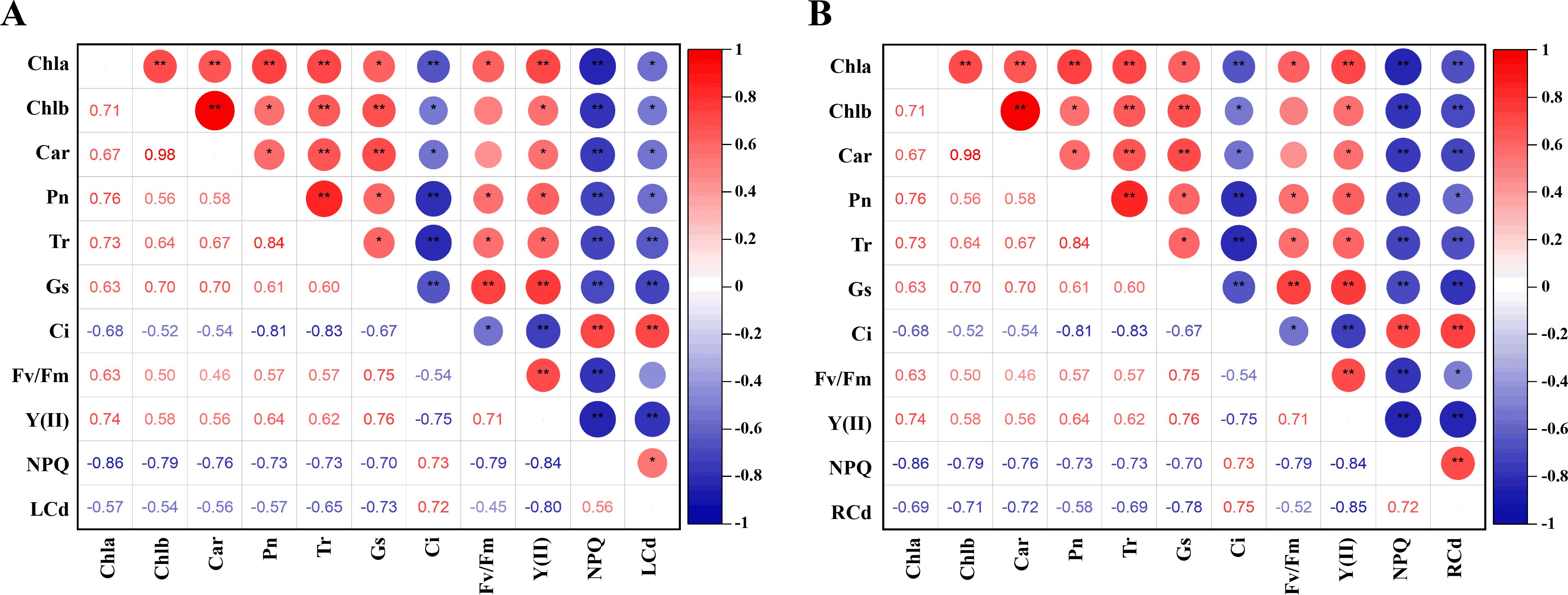 We conducted correlation analyses to explore the relationship between the photosynthetic system and Cd content in tomato plants. As shown in Figure 3, leaf Cd content exhibited a significant positive correlation with non-photochemical quenching (NPQ) and intercellular CO2 concentration (Ci), while showing significant negative correlations with chlorophyll a (Chl a), chlorophyll b (Chl b), carotenoids (Car), and net photosynthetic rate (Pn). Moreover, leaf Cd content was highly negatively correlated with the effective quantum yield of photosystem II [Y(II)] and stomatal conductance (Gs). Similarly, root Cd content was strongly positively correlated with NPQ and Ci, significantly negatively correlated with Pn and the maximum quantum efficiency of PSII (Fv/Fm), and highly negatively correlated with Chl a, Chl b, Car, transpiration rate (Tr), Gs, and Y(II). These patterns clearly demonstrate that Cd accumulation inflicts severe impairment on the photosynthetic machinery of tomato seedlings, disrupting pigment levels, gas exchange, and photochemical efficiency, thereby compromising overall photosynthetic performance.