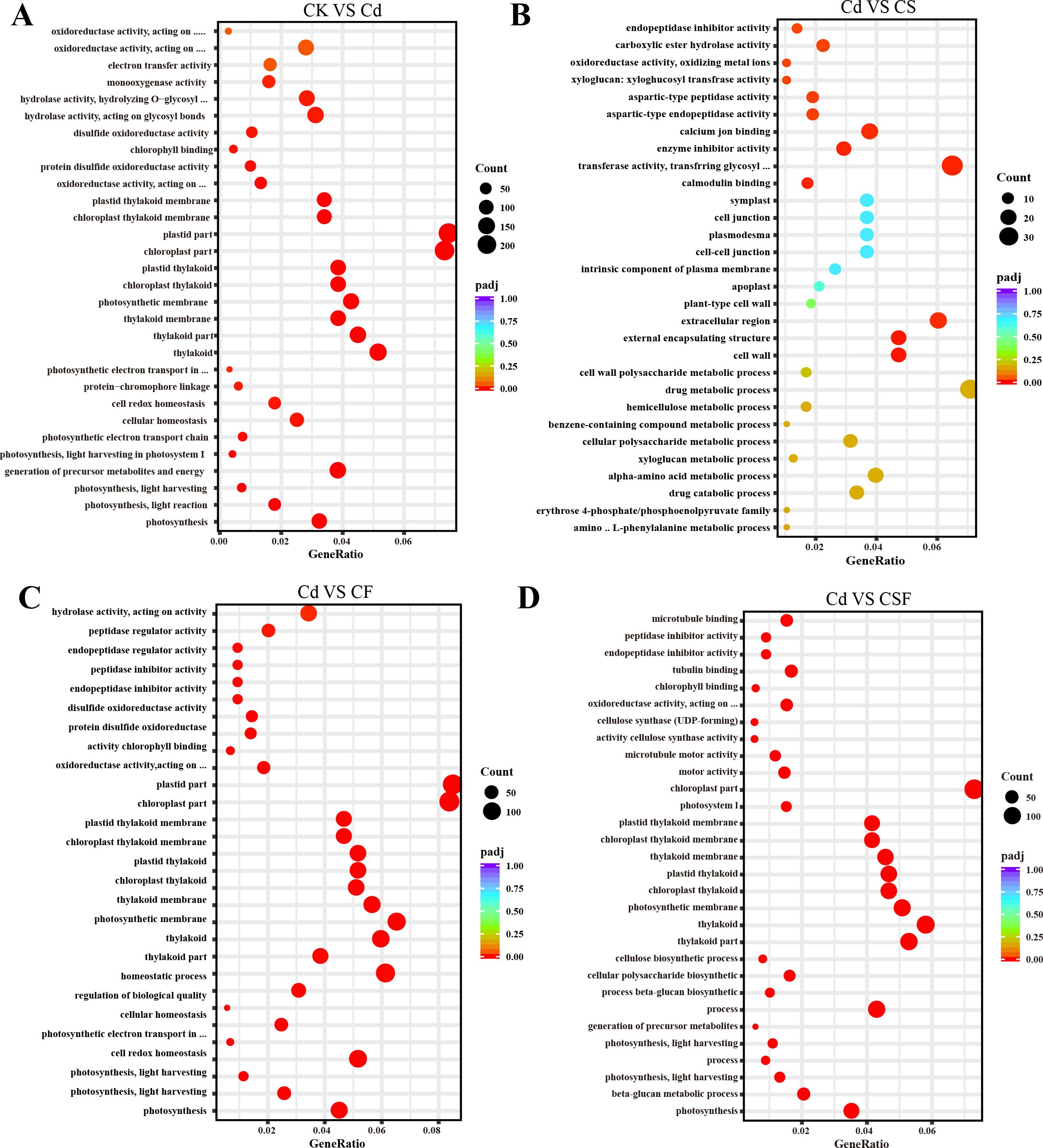 Figure 4. GO analysis in tomato seedling leaves. (A) CK vs. Cd, (B) Cd vs. CS, (C) Cd vs. CF, and (D) Cd vs. CSF. The size of the bubbles indicates the number and the color indicates the p-value: the redder the color, the lower the p-value.