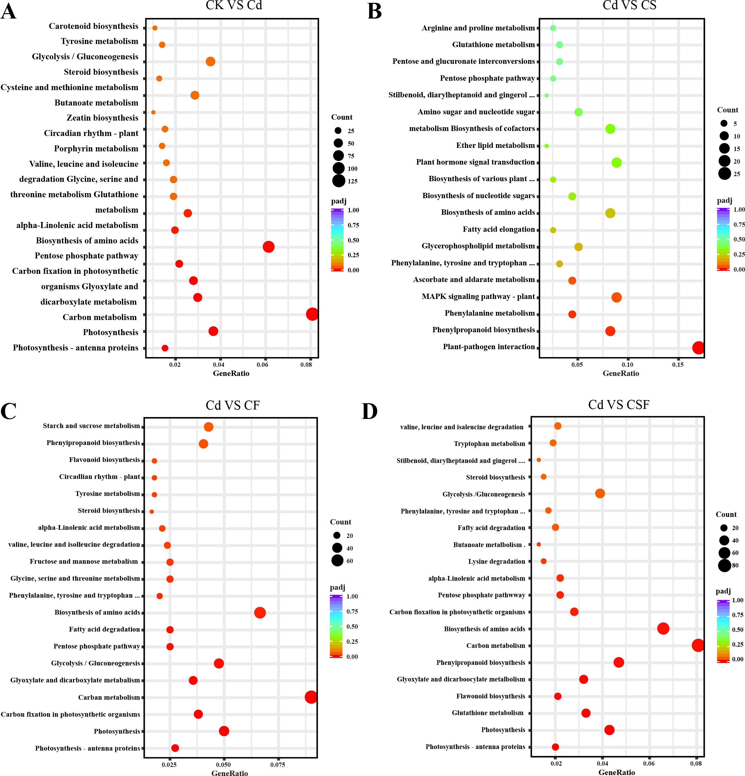 Figure 5. KEGG analysis in tomato seedling leaves. (A) CK vs. Cd, (B) Cd vs. CS, (C) Cd vs. CF, and (D) Cd vs. CSF. The size of the bubbles indicates the number, and the color indicates the p-value: the redder the color, the lower the p-value.