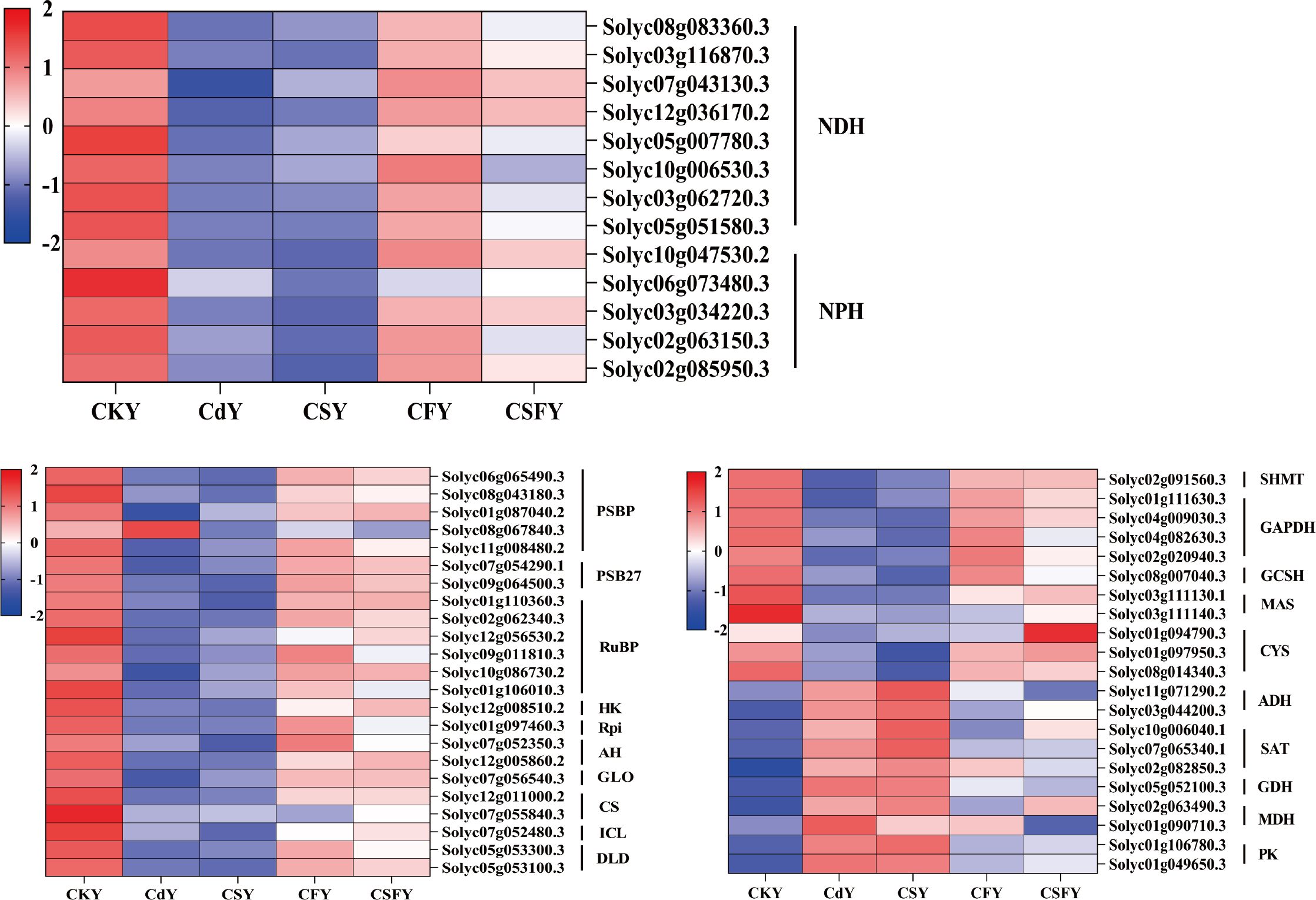 Cadmium markedly alters the expression of genes involved in photosynthesis and carbon metabolism in tomato seedlings. Silicon alone exerts minimal mitigation of Cd effects, whereas iron (CF) and the combined silicon and iron treatment (CSF) significantly alleviate Cd-induced disruptions in these pathways (Figure 6).