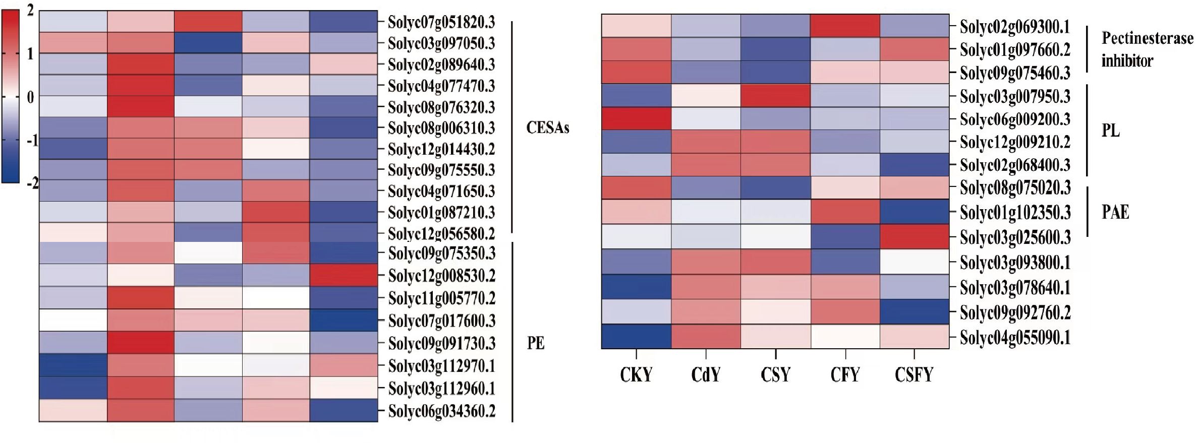 The cell wall, characterized by its thick, resilient, and slightly elastic structure, acts as the primary barrier against Cd stress in plants (Cosgrove, 2023). Exposure to Cd upregulates genes involved in cell wall synthesis, such as CESAs, PE, and PL, while downregulating pectin esterase inhibitors and PAE. This response is partially mitigated by Si or Fe application, with their combined use exerting a markedly stronger restorative effect (Figure 7).
