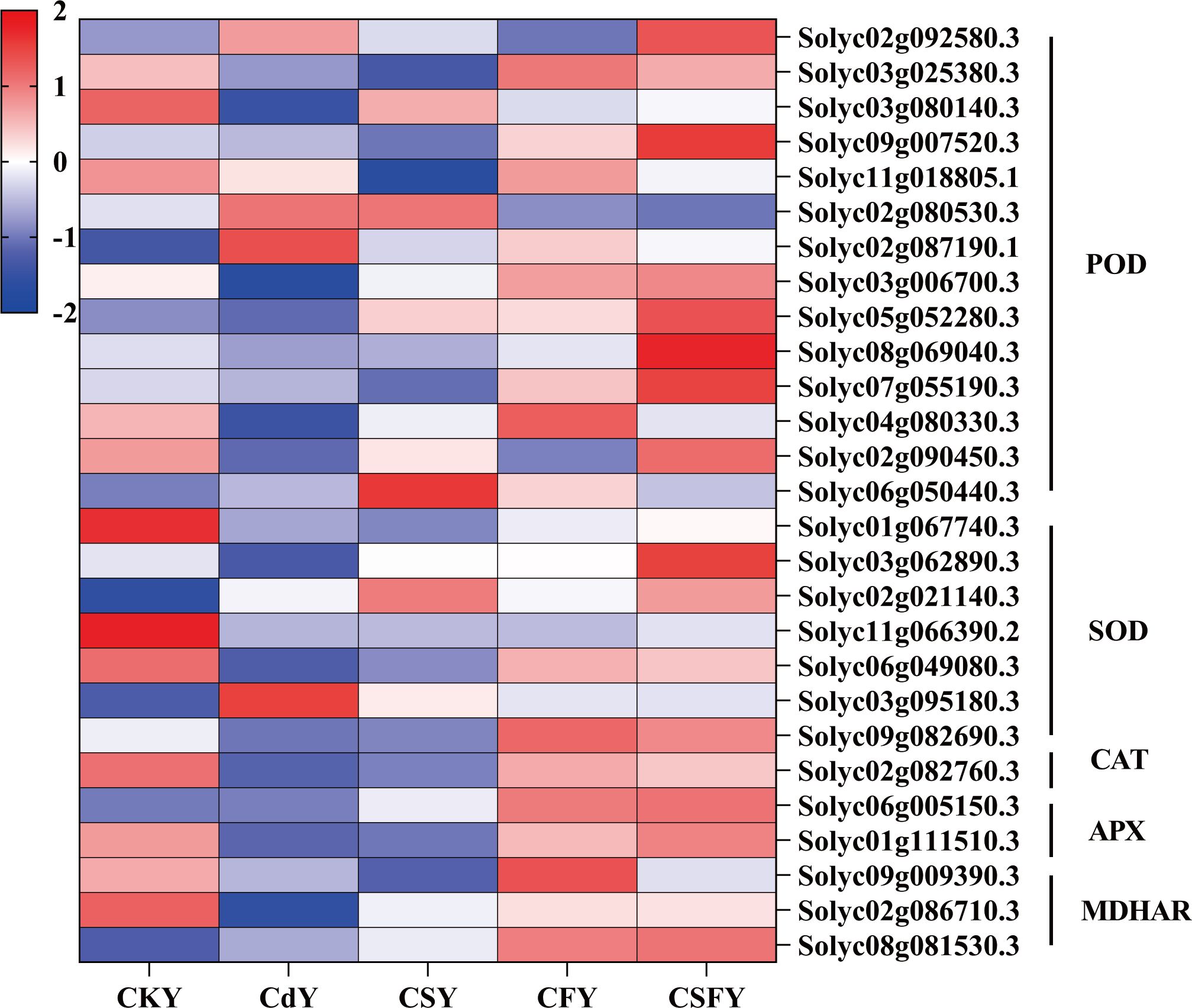 DEGs related to antioxidant enzymes (POD, SOD, CAT, APX, and MDHAR) were significantly downregulated following Cd application. Conversely, in the presence of CS or CF, the expression of these genes was upregulated. The expression of genes encoding antioxidant enzymes was significantly upregulated in tomato seedlings when Si and Fe were co-applied. This suggests that Si and Fe can produce positive benefits for each other to alleviate the damage of tomato seedlings by Cd (Figure 8).