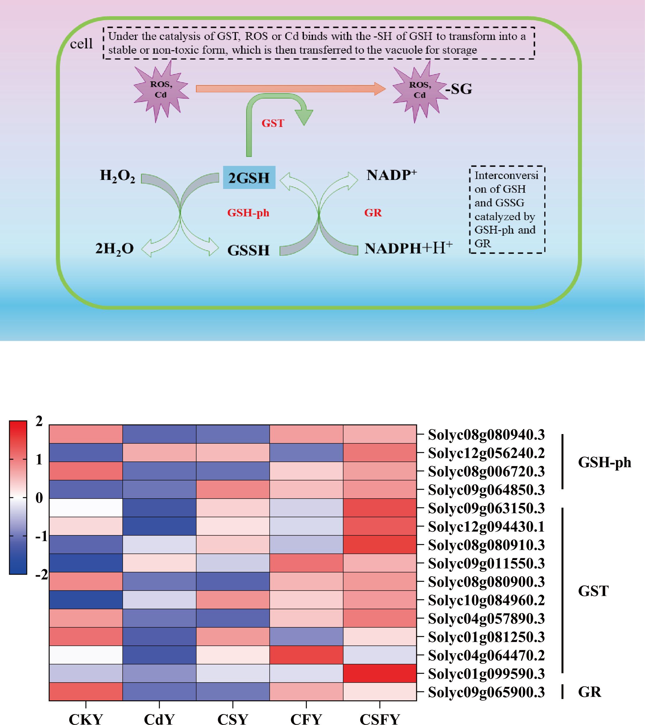 Glutathione (GSH), an endogenous antioxidant, not only neutralizes free radicals in plants but also scavenges heavy metals, including Hg, Cd, and As (Hasanuzzaman et al., 2017). Here, Cd inhibited the expression of glutathione-ph, glutathione S-transferase (GST), and glutathione reductase (GR). Conversely, the expression of these genes showed an opposite trend in CS and CF compared to that in Cd and was significantly upregulated in CSF (Figure 9).