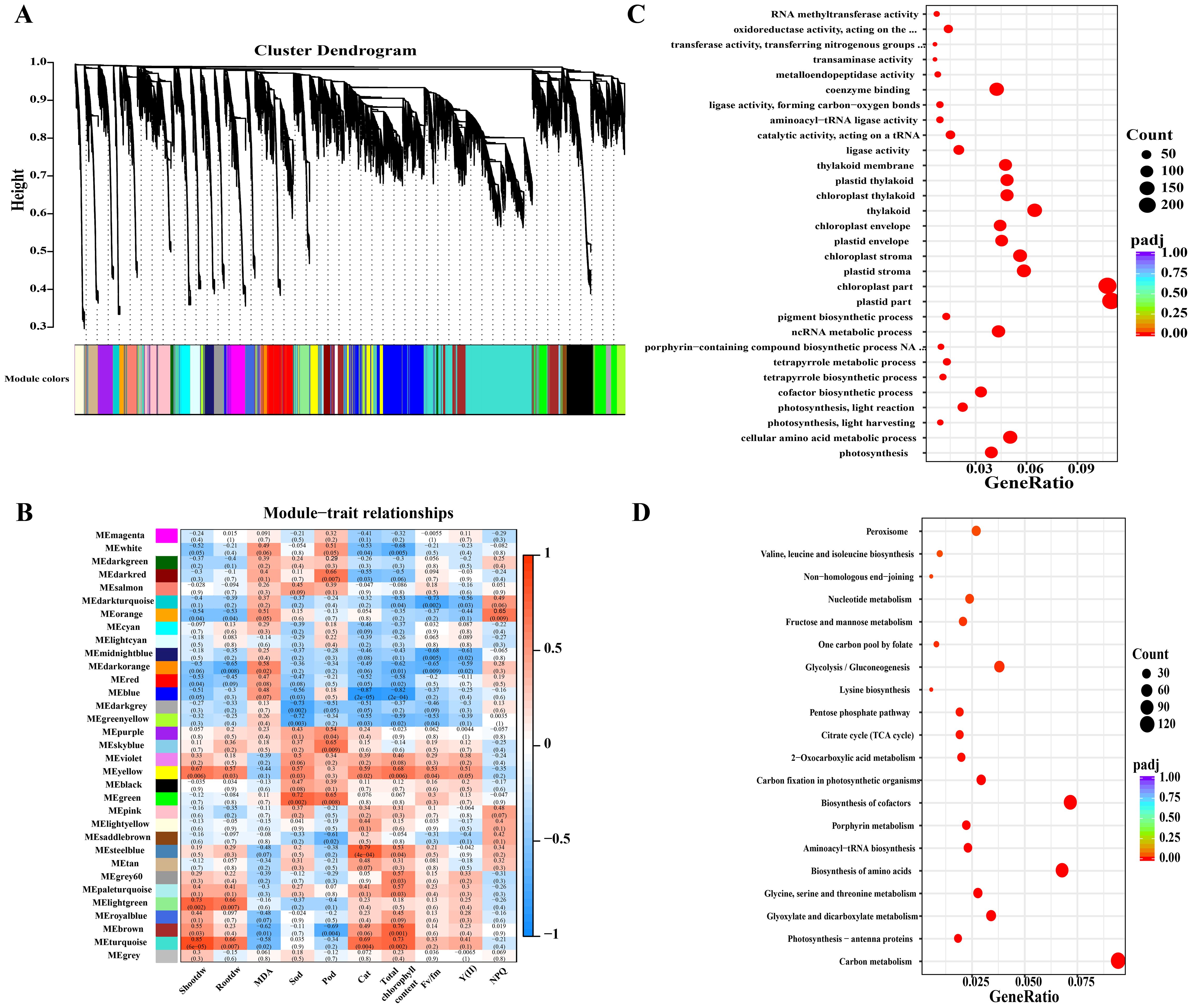 Based on WGCNA, 33 unique modules were identified based on their correlation with the trait. Ten resistance indicators, including shoot dry weight, root dry weight, chlorophyll content, and the chlorophyll fluorescence index [Fv/Fm, Y(II), and NPQ], were used (Figure 10B). The findings indicate a positive correlation between genes in various modules and resistance indices. Turquoise, violet, and yellow modules were significantly correlated with shoot dry weight, root dry weight, CAT, and photosynthetic indices, including chlorophyll content, Fv/Fm, and Y(II). The turquoise module showed significant positive correlations with the photomagnetic, metabolic, and relative parameters. GO and KEGG analyses were performed following the analysis of the module genes. Figures 10C, D illustrate the GO and KEGG pathways associated with the turquoise module. The GO results indicated that most genes (p < 0.05) were enriched in photosynthesis reactions, cellular amino acid metabolism harvesting, photosynthesis–light reactions, plastids, chloroplasts, and coenzyme binding. In the KEGG analyses, the carbon metabolism, photosynthesis-hapten proteins, photosynthetic biocarbon fixation, citrate cycle, biosynthesis of amino acids and glyoxylate, and biosynthesis of cofactors were the most significantly enriched genes.