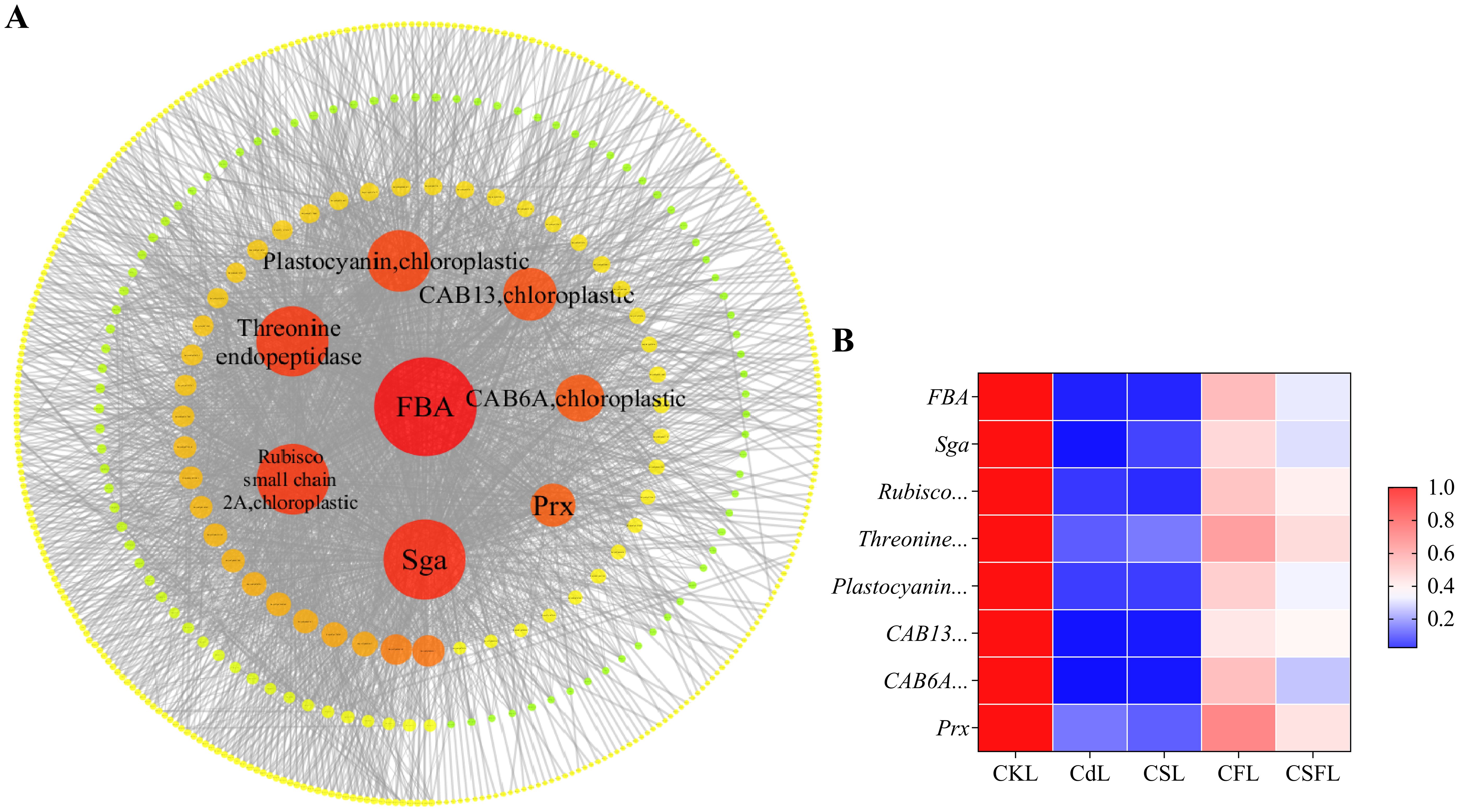 Since the number of genes in the turquoise module of WGCNA is even larger and the enriched pathway echoes the results of previous experiments, we further analyzed the turquoise module. In the turquoise module, eight hub genes were selected from the edges. They contain genes related to photosynthesis and stress tolerance. One of the selected genes was Solyc02g06234.3, which encodes a fructose-bisphosphate aldolase (FBA). Other genes included serine-glyoxylate aminotransferase; chlorophyll a-b binding protein 13, chloroplastic; RuBisCO small chain 2A, chloroplastic; threonine endopeptidase; plastocyanin, chloroplastic; peroxiredoxin (Prx); chlorophyll a-b binding protein 6A; and other chloroplastic genes (Figure 11A). Figure 11B shows the expression of these eight genes under different treatments compared to that in the CK, and all eight genes were downregulated in the Cd treatment. Compared to Cd, the expression of Sga and threonine endopeptidase was upregulated in CS, and all eight genes were significantly upregulated in CF and CSF.