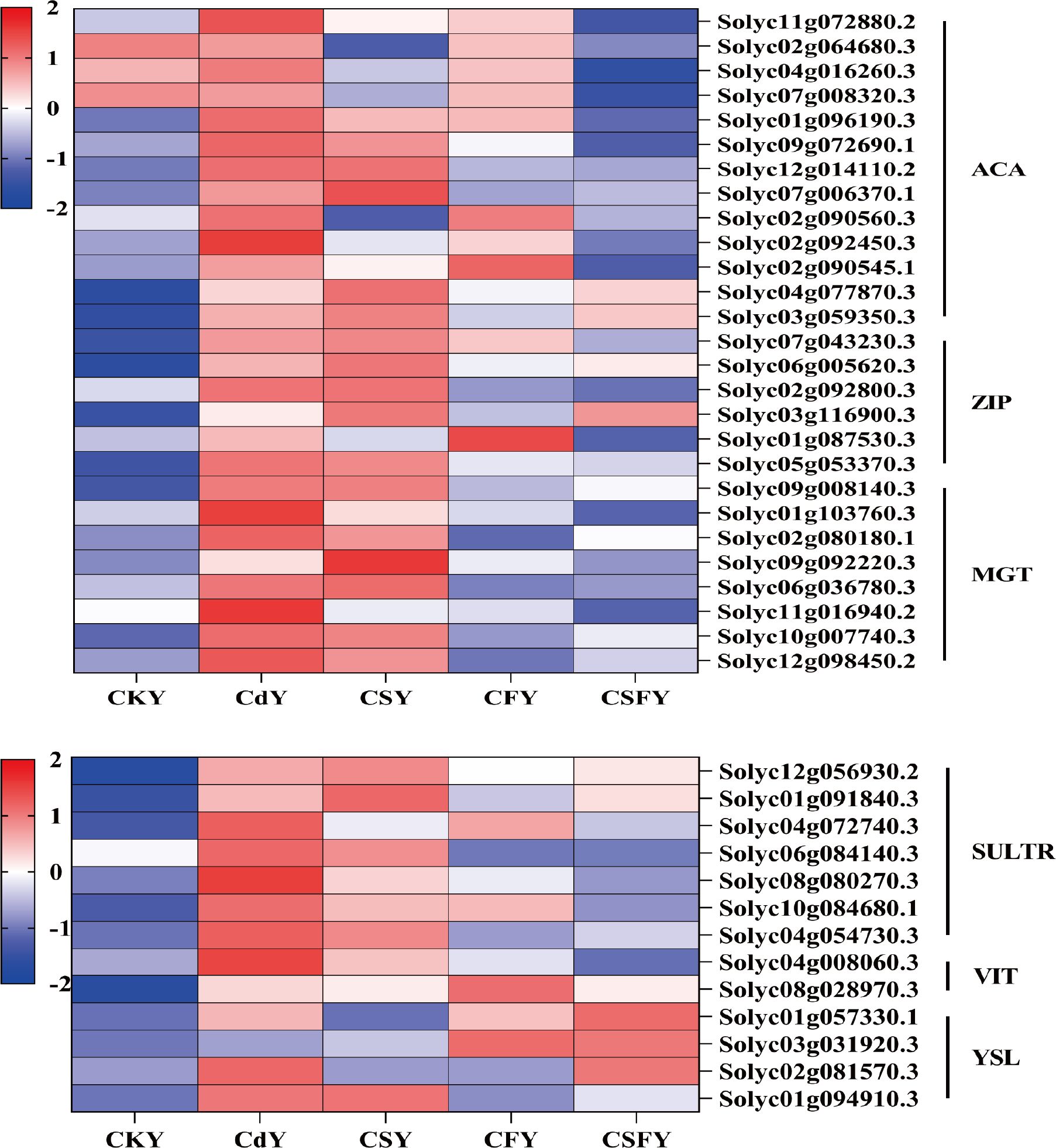 Elemental transporter proteins influence the uptake and distribution of elements in plants. Cd from soil and the atmosphere accumulates in plants through root and leaf absorption. Currently, several transporter proteins related to Cd and its chelates, such as ZIP and YSL, have been identified using genetic engineering and molecular biology techniques (Cao et al., 2018). In this experiment, Cd exposure upregulated genes encoding ACA, ZIP, MGT, SULTR, VIT, and YSL, while CSF treatment significantly downregulated these genes (Figure 12). This suggests that co-application of silicon and iron reduces Cd uptake in tomato seedlings by suppressing the expression of transporter protein genes.