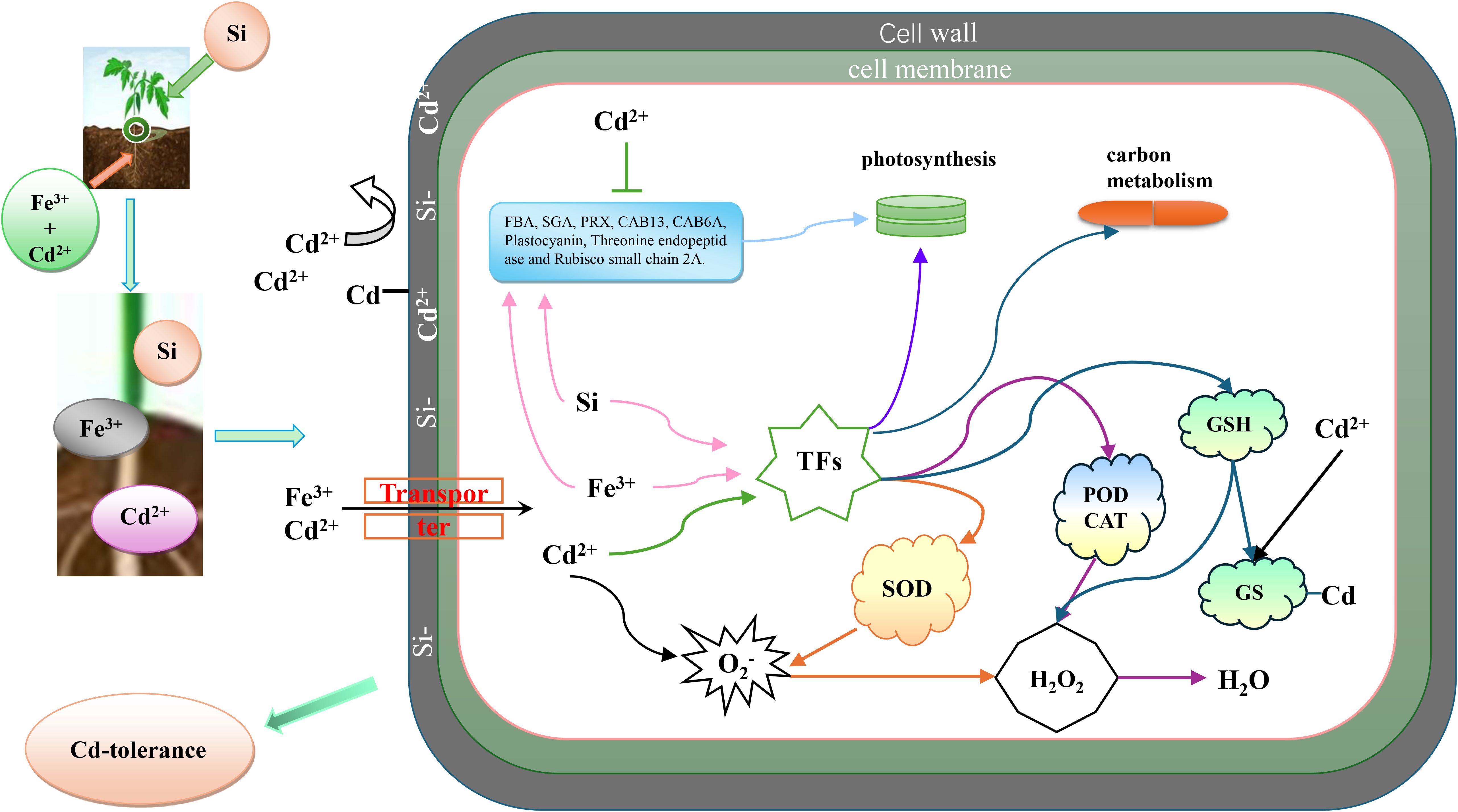 The figure illustrates the application of combined silicon (Si) and iron (Fe) treatments to alleviate cadmium (Cd) stress in tomato seedlings. In this study, Si was applied to the leaves, while Fe was supplied to the roots. Silicon is incorporated into the cell walls, enhancing their strength and rigidity, which serves as the first line of defense by limiting Cd entry through adsorption and immobilization. Since plants lack specific transporters for Cd, Cd ions compete with essential elements such as Fe for uptake into cells. Upon entering the cells, Cd induces the excessive generation of reactive oxygen species, including superoxide anions (O2-), and alters the expression of certain TFs and genes, resulting in cellular damage. The combined application of Si and Fe effectively mitigates Cd-induced toxicity by reinforcing cell wall barriers, reducing Cd uptake, enhancing antioxidant enzyme activities, and stabilizing gene expression. These mechanisms collectively contribute to the protection of tomato seedlings against Cd stress (Figure 13).