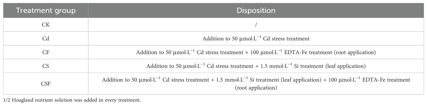 The experiment was conducted from October 2022 to November 2023 in the plant factory and laboratory at the College of Horticulture, Sichuan Agricultural University (plant factories provide artificially regulated environments for plant growth needs) (Hu et al., 2014; Zou et al., 2024). Tomatoes (Lycopersicon c.v. “Lv Feicui”) were used as the treatment material. The seeds were previously screened by the laboratory and sourced from Shou Guang Hongwei Seed Industry Co., Shandong Province (Su et al., 2021). The hydroponic nutrient solution used for testing was 1/2 Hoagland nutrient solution (pH 6.2), and the stress treatments were designed by augmenting this base solution with 50 μmol·L−1 CdCl2·2.5H2O, 1.5 mmol·L−1 Na2SiO3·9H2O, and 100 μmol·L−1 EDTA-Fe. Silicon and iron concentrations were rigorously quantified in preliminary analyses. Owing to the absence of the silicon efflux transporter protein (SILsi-2-L) in the tomato root system, silicon predominantly accumulates within the roots, exhibiting limited translocation to the shoots; thus, foliar application is employed to ensure efficient silicon delivery to aerial tissues. Details of the experimental treatments are listed in Table 1.
