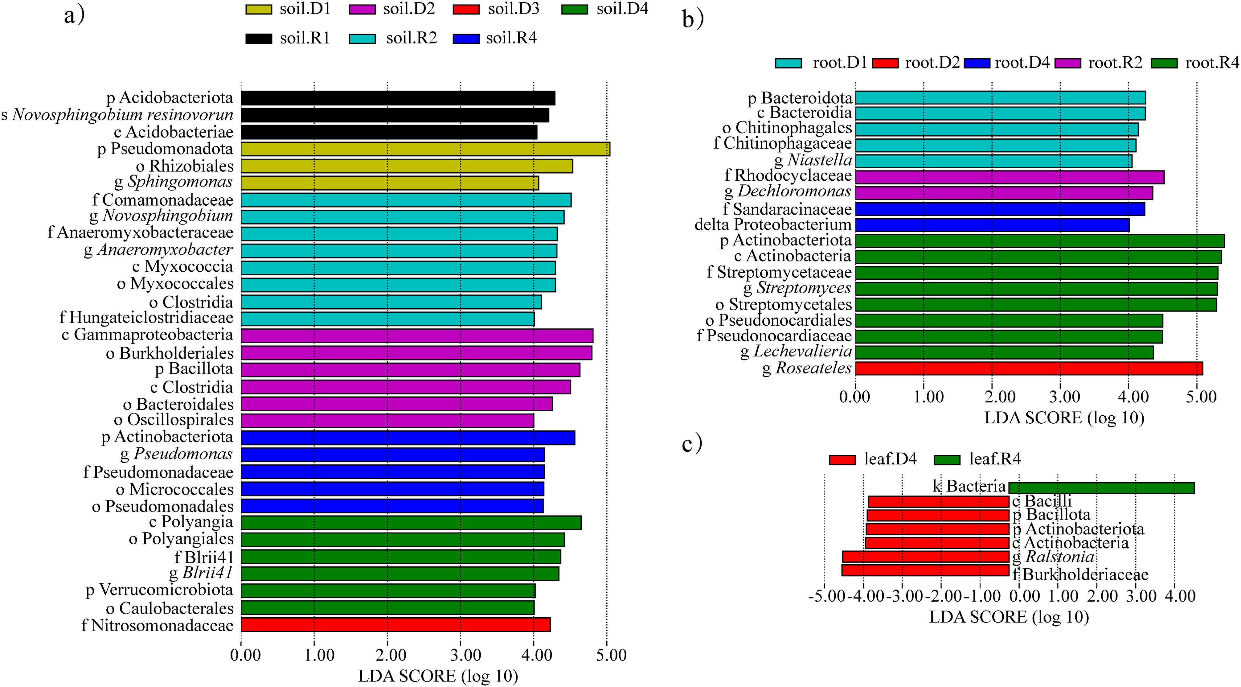 Figure 8. Significantly different bacteria in A. senescens after drought stress and re-watering. (a) LEfSe analysis of bacterial community in rhizosphere soil, (b) LEfSe analysis of bacterial community in root, (c) LEfSe analysis of bacterial community in leaf.