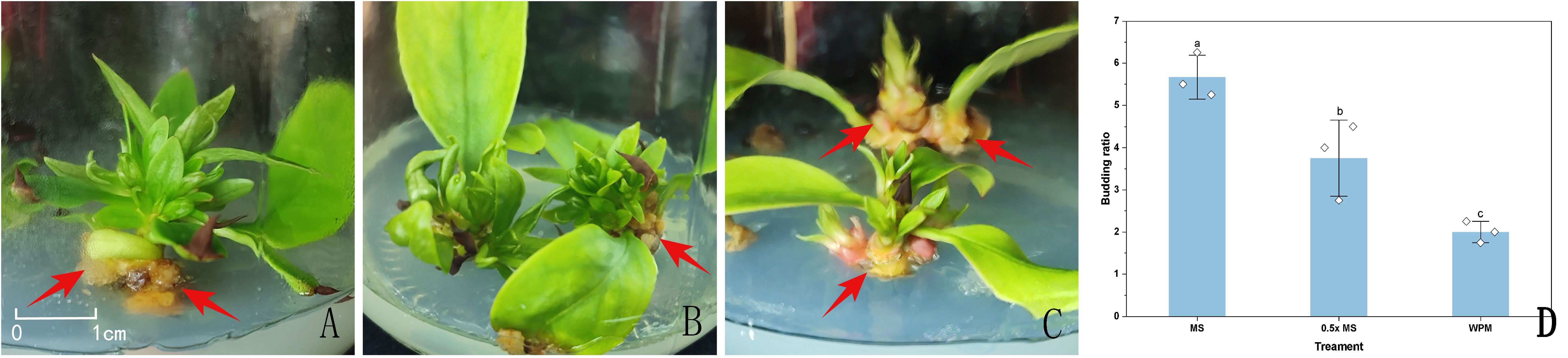 Figure 2. Sprouting buds in different media approximately 20 days after inoculation. (A) sprouting buds in MS medium; (B) sprouting buds in 0.5x MS medium; (C) sprouting buds in WPM medium; (D) Effect of different culture media on the induction of sprouting buds. Red arrowheads indicate callus formation observed at the base of the explants. Data in the (D) are presented as the mean ± standard deviation (SD) of three independent replicates. Different lowercase letters indicate significant differences between treatments (P < 0.05).