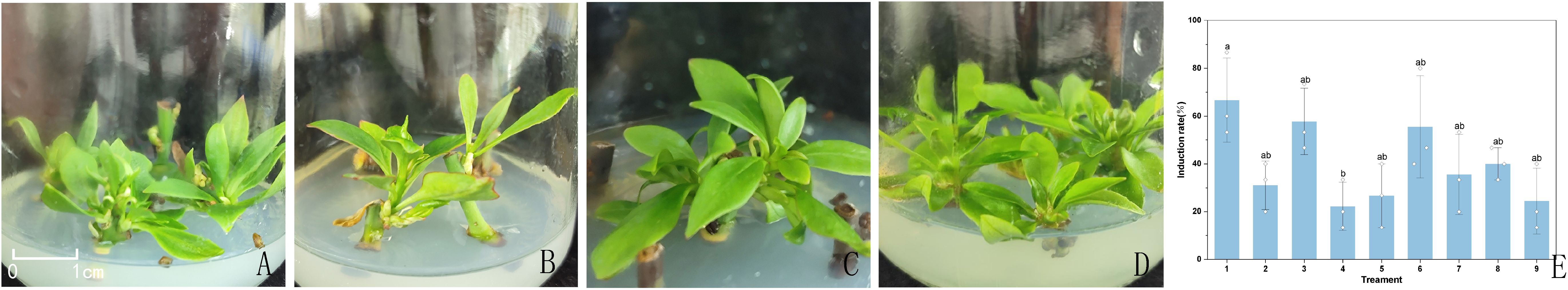 Figure 3. Buds induced in three hormone combinations. (A) buds induced by treatment 1; (B) buds induced by treatment 3; (C) buds induced by treatment 6. (D) buds induced by treatment 4. (E) Effect of different hormone ratios on the induction of sprouted stem segments. Treatments 1, 3, and 6 were selected as representative results due to their highest induction rates, while treatment 4, with the lowest induction rate, was included for comparison. Data in the (E) are presented as the mean ± standard deviation (SD) of three independent replicates. Different lowercase letters indicate significant differences between treatments (P < 0.05).