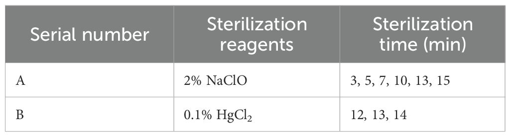 To optimize the sterilization protocol, the effects of two commonly used sterilizing agents, NaClO and HgCl2, were systematically compared, and sterilization procedures were developed for different types of explants to identify the most suitable sterilization conditions.