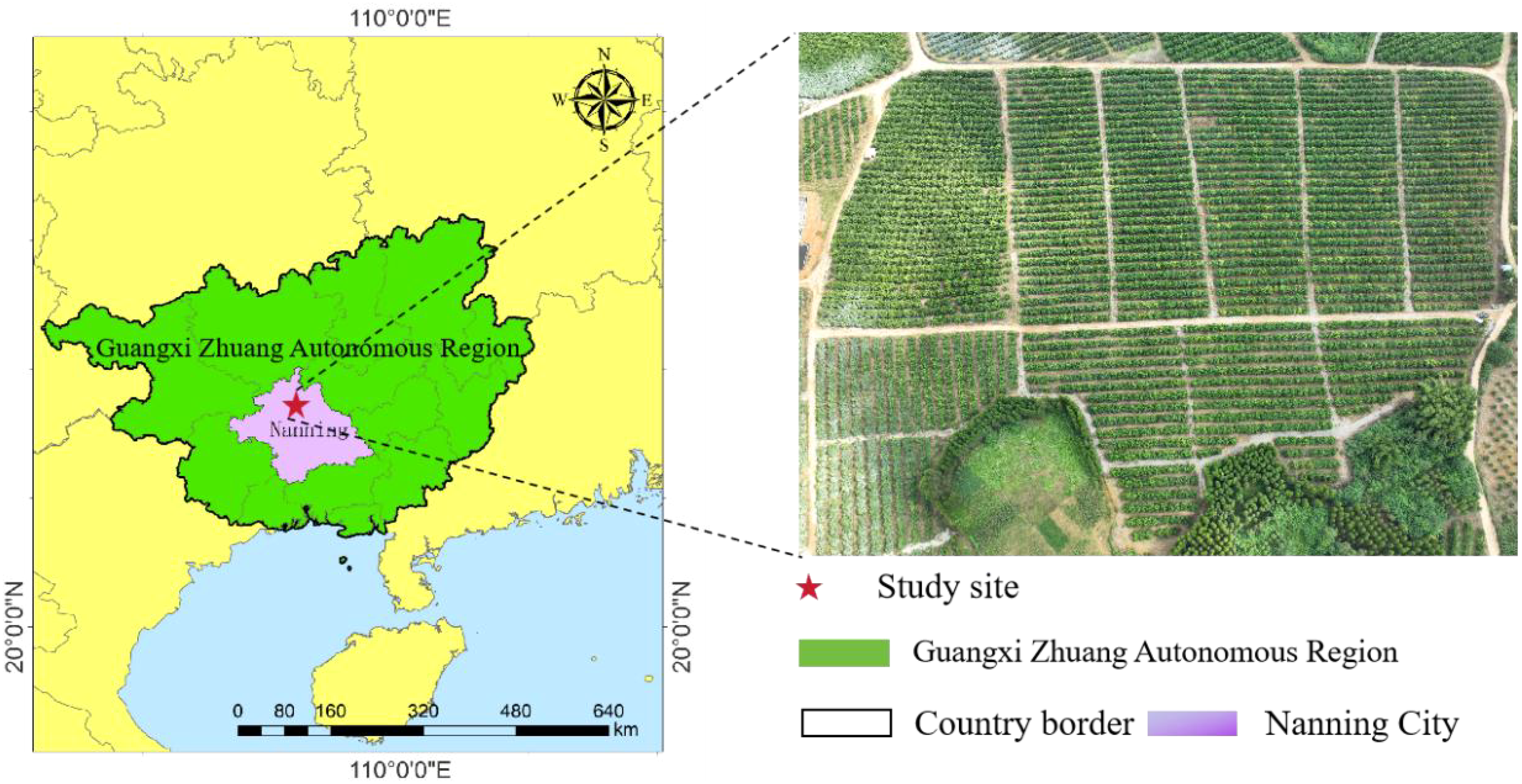 This study was conducted in an Orah mandarin orchard located in Wuming District, Nanning City, Guangxi Zhuang Autonomous Region, China (22°59′58″ N, 108°37′22″ E). The orchard is located in the subtropical monsoon region (Figure 2). It covers an area of approximately 50 hectares with a row spacing of 4.5 m and plant spacing of 3.0 m.