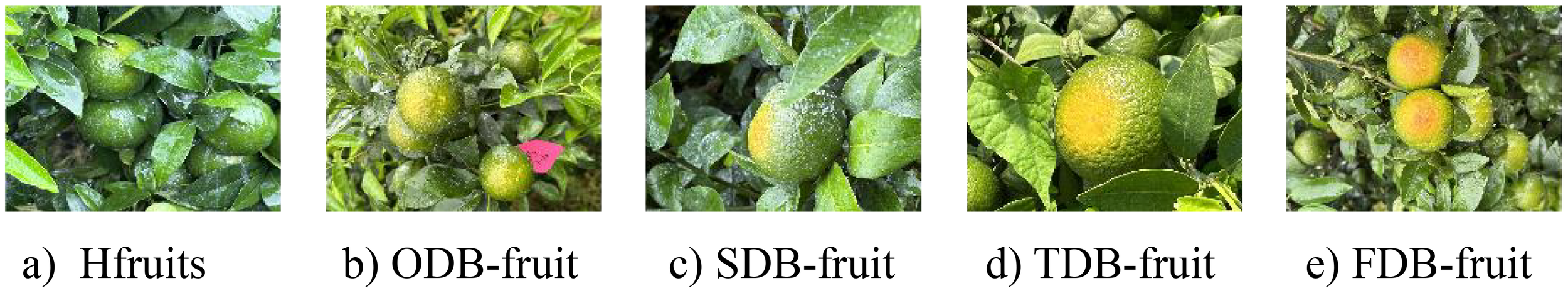Sample images of citrus sunburn at different degrees. The criteria for this 5-level division are as follows: (a) Hfruits: The fruit is pure green without any color difference, categorized as normal and healthy. (b) ODB-fruit: The fruit has a slight yellowing, or a small part of it turns yellow, which indicates that the fruit was already green and had a trend of discolouration due to burns. (c) SDB-fruit: The fruit has obvious discolouration, but the proportion of the discolored area is relatively small, usually less than 25% of the light-facing area. (d) TDB-fruit: The fruit has a relatively large area of burns, but dry scars and scabs have not yet formed, accounting for 25%-66.7% of the area. (e) FDB-fruit: The fruit has severe burns, and dry scars and scabs have formed, or the area of abnormal discolouration caused by the burns exceeds 66.7%.