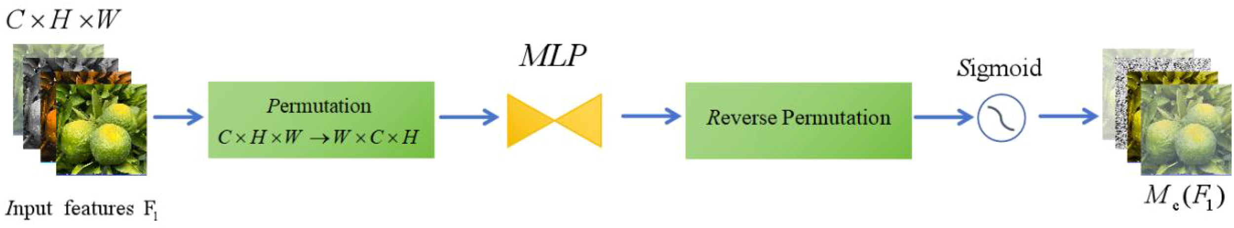 Multi-layer perceptron (MLP): The pooled channel description is sent through a two-layer MLP, after which the weight of each channel is output. The process formula is as shown in Equation 2: