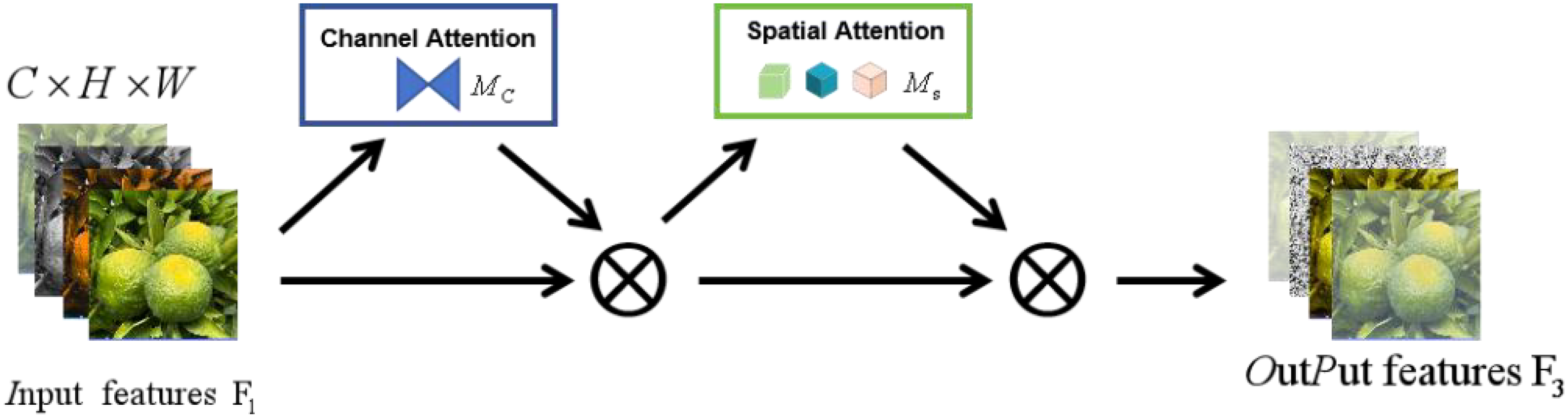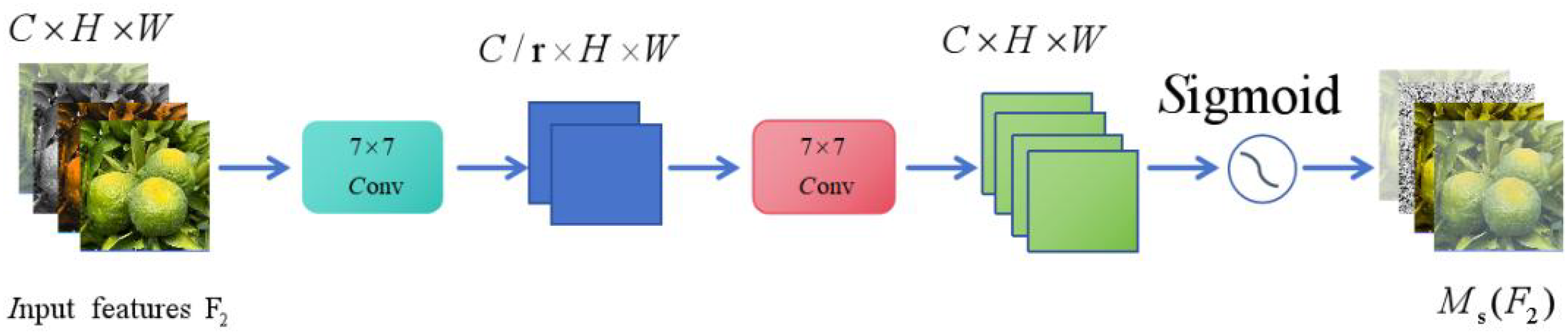 where is the channel-enhanced feature, is the spatial attention map, represents element-by-channel multiplication, and the final output features can be obtained after the above steps See Equation 5 and Figure 8 for details.