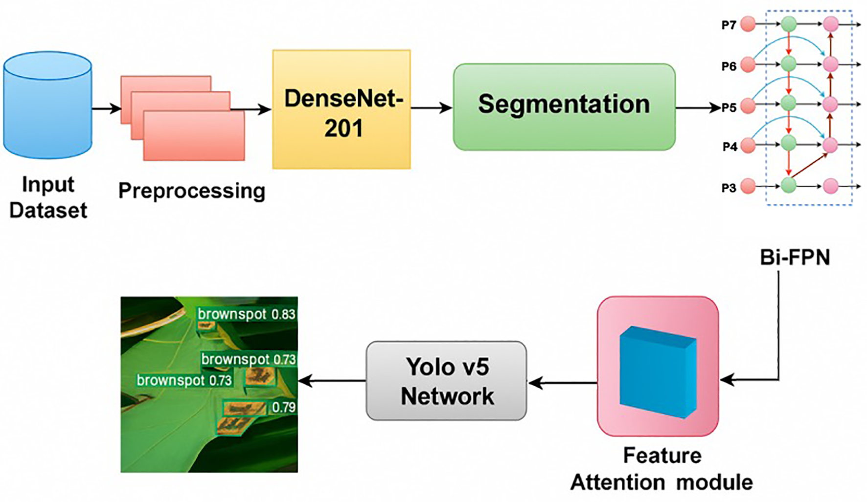 Figure 1 had illustrated a suggested method by (Kumar et al., 2023), which employed a Multi-scale YOLO v5 detection network with DenseNet-201 serving as the backbone network and depth-aware instance segmentation. Besides, the proposed Bidirectional Feature Attention Pyramid Network (Bi-FAPN) was employed to improve feature extraction and disease detection across various scales. In this research, the YOLO v5 network, incorporated with depth-aware instance segmentation (DAIS) and Bi-FAPN, had demonstrated an excellent performance, with an accuracy of 94.78%. This integrated model was outperformed than the other existing approach, including YOLO v3, YOLO v4, YOLO v5, Faster R-CNN, Mask R-CNN, and RPN. For future improvements, the authors mentioned to involve sensor integration into the model for further monitoring and maintaining the rice quality. However, Bi-FAPN also has its limitations. The main challenge lies in its computational complexity; the integration of bidirectional feature attention increases the number of parameters and operations, leading to higher computational cost and longer training times. This can make Bi-FAPN less efficient for real-time applications or for environments with limited computational resources. Furthermore, the performance improvements offered by Bi-FAPN may not always justify the increased complexity, especially for simpler tasks where less sophisticated architecture might suffice. The design of attention modules and the choice of pyramid levels also require careful tuning, and suboptimal configurations can lead to overfitting or diminished performance. Finally, while BFAPN excels in tasks requiring intricate spatial and feature understanding, its benefits may be less pronounced in simpler tasks or on datasets where the added attention mechanisms do not provide substantial improvements.