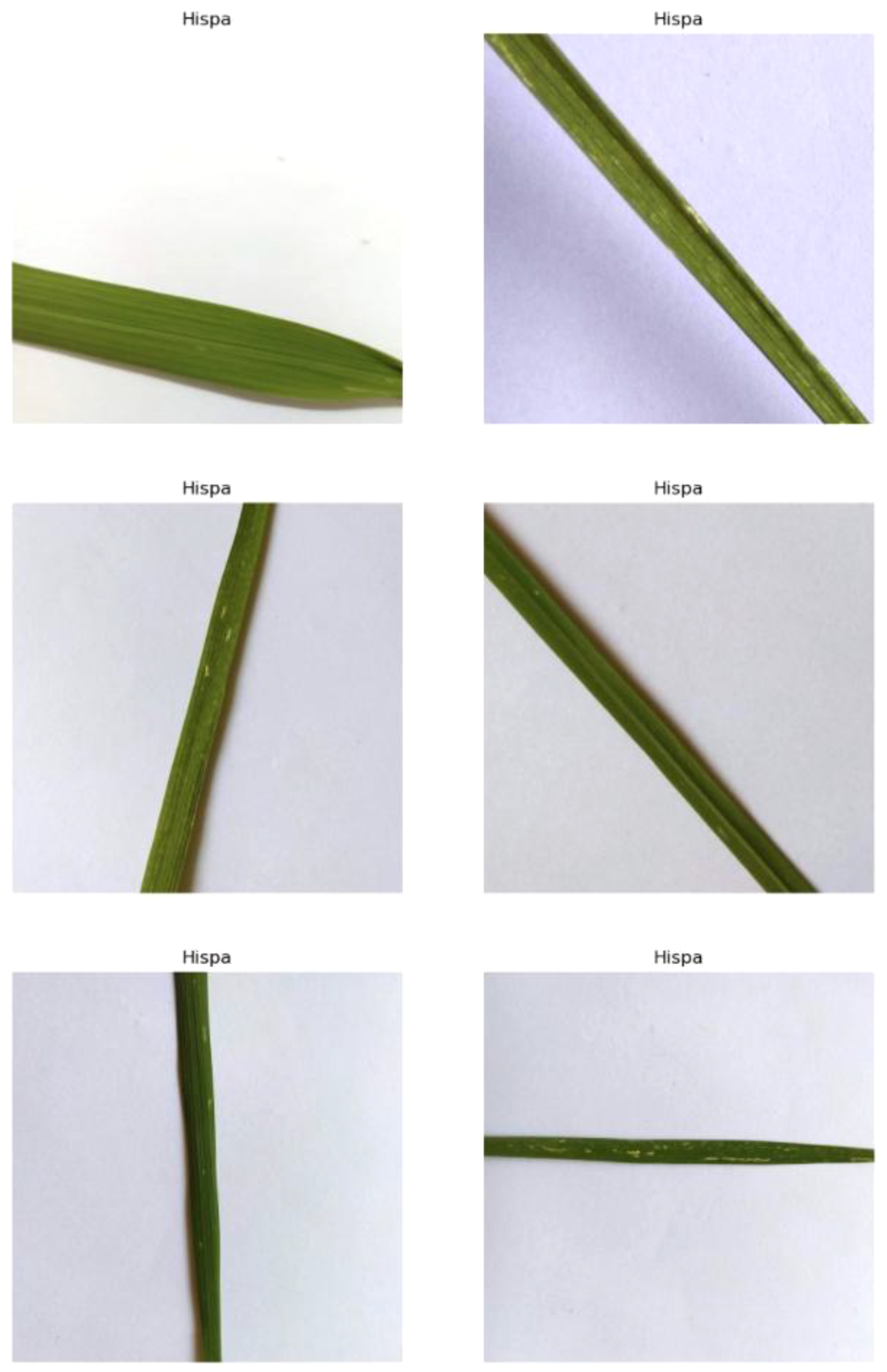 This disease is caused by the Hispa beetle, also known as the spiny beetle, due to the spines on its exoskeleton. The infestation by these pests’ results in the formation of silvery parallel streaks and spots on the leaves, as shown in Figure 5. The Hispa beetle primarily attacks the leaves of the rice plant, where the adult beetles feed by scraping off the green tissue from the upper leaf surface. This feeding activity creates the characteristic silvery streaks and can lead to significant damage if left unmanaged.