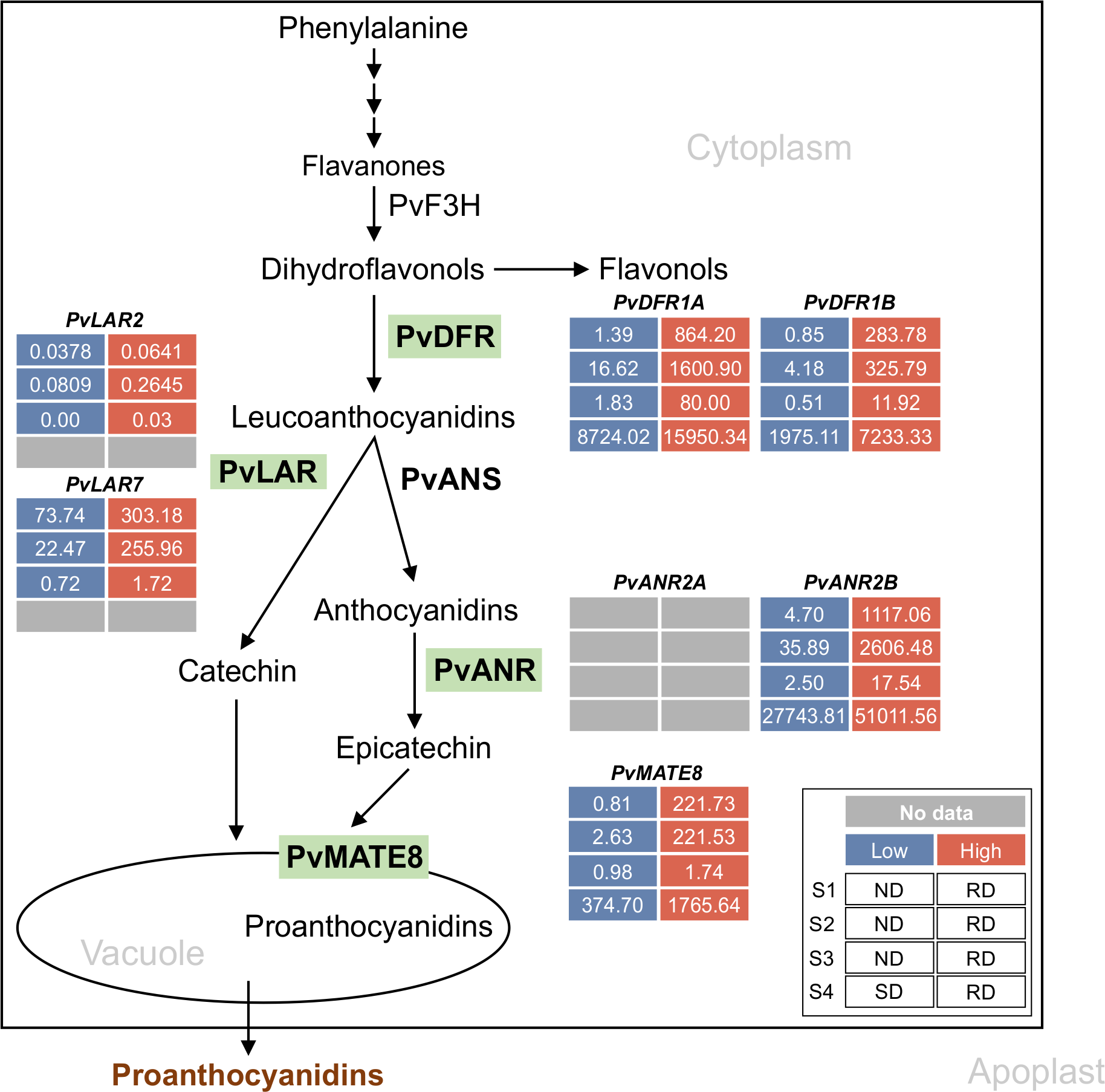 Proanthocyanidin-specific branch of phenylpropanoid biosynthetic pathway in common bean. Green highlights indicate the enzymes encoded by the late biosynthetic and transporter genes. Differential transcript expression in RD, SD and ND lines for the candidate genes are shown (legend on the inset). Inset description: S1, S2 and S3 indicate early, intermediate and mature stages of seeds and S4 represent the 50 mg seed coat used in Freixas Coutin et al., 2019 and Duwadi et al., 2018, respectively. Low, high and no available transcript values are color coded.