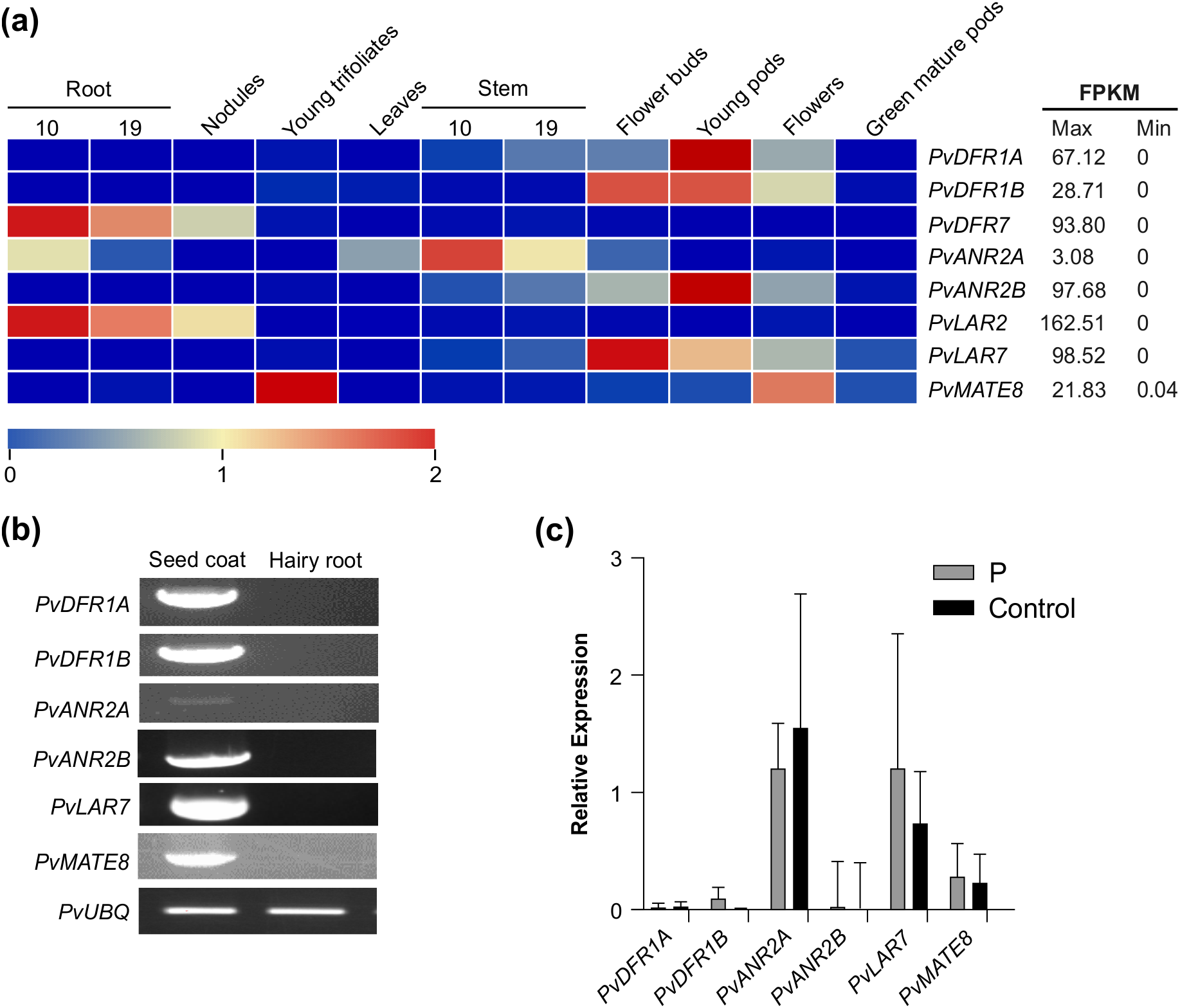 Expression of candidate PA biosynthetic and transporter genes in different tissues of common bean. (a) tissue-specific expression profile of the target genes in common bean. Transcript data retrieved from Phytozome for landrace G19833 was used for the generation of heatmap. The color key represents the relative transcript abundance in a row with the log2 transformed values. (b) RT-PCR showing expression of candidate genes in pinto bean seed coat and hairy root tissues. (c) RT-qPCR showing the transcript abundance of PA biosynthetic and transporter genes in the hairy root lines overexpressing P and control.