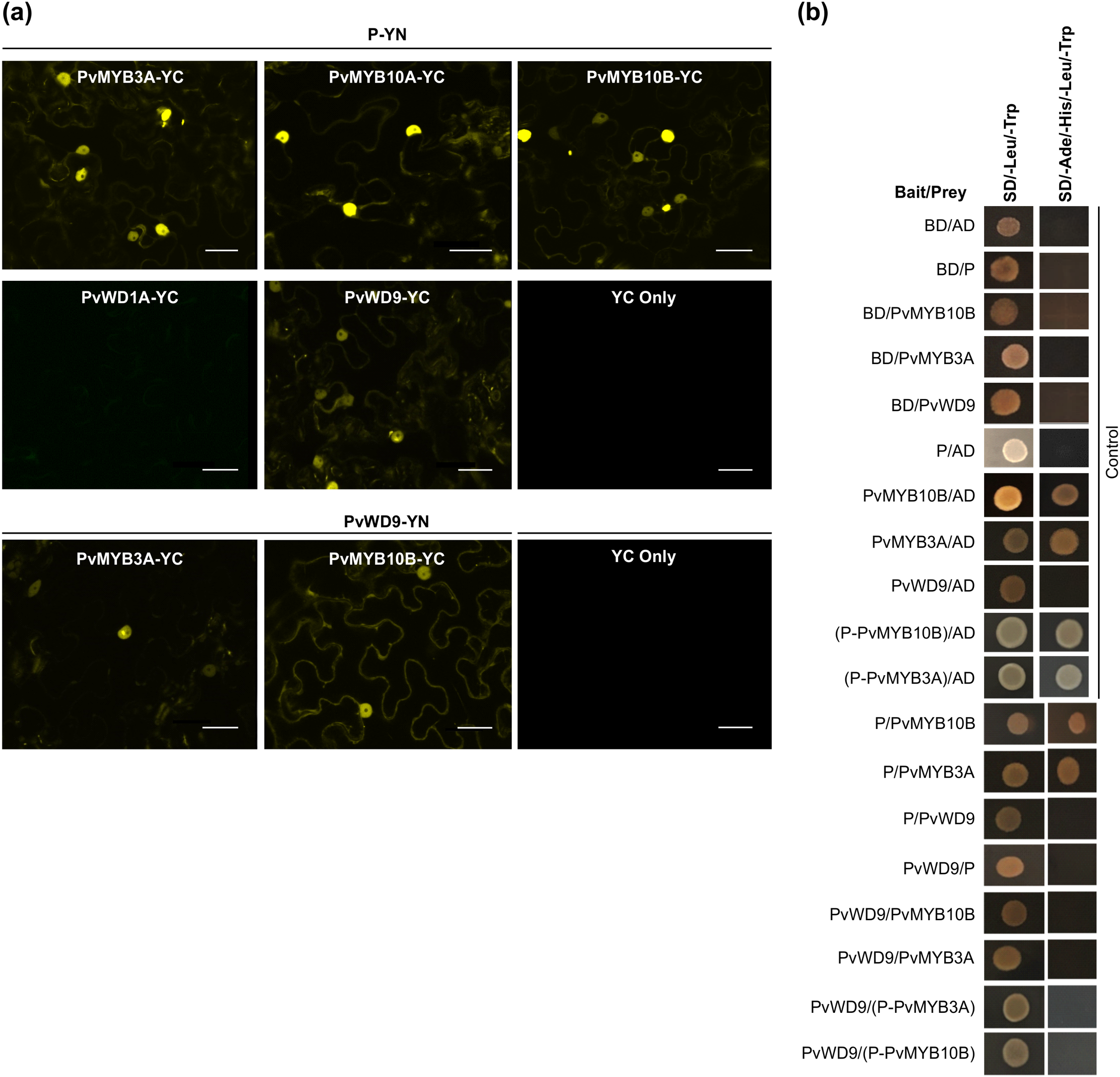 To further confirm the protein-protein interaction, interaction assays between P, PvMYBs and PvWD9 in pairwise combinations were performed by using a targeted Y2H assay. All the candidate proteins were independently used as either a bait protein (fused with DNA-binding domain, BD) or a prey protein (fused with activation domain, AD) (Figure 3b). Controls included each of the test proteins as bait with an empty vector as prey and its reciprocal combinations. Additionally, a combination of both empty vectors (BD/AD) was also included as a negative control. Controls were included in each experiment on the same plate to ensure the plate quality. As shown in Figure 3b, both PvMYB3A and PvMYB10B (baits) and empty vector (prey) co-transformed yeast colonies grew on the synthetic defined (SD) media lacking Ade, His, Leu and Trp suggesting the auto-activation of PvMYB3A and PvMYB10B. Therefore, Y2H assays were performed in all combinations of baits and prey except for the ones that showed auto-activation. The results revealed that P interacts with PvMYB3A and PvMYB10B but not with PvWD9. Furthermore, PvWD9 did not interact with either of the PvMYBs in the Y2H assay. Since PvWD9 did not interact with P and both PvMYBs in yeast, we speculated that both P and MYB together are possibly required for PvWD9 binding in the ternary complex. Thus, two separate fusion constructs were created by fusing P with PvMYB3A and P with PvMYB10B using an 18 bp linker. Both the constructs were cloned to the bait and prey vectors, and Y2H assays were performed with PvWD9. P-PvMYB3A and P-PvMYB10B when fused to the BD, showed auto-activation. In the Y2H assays for the fusion proteins, no interaction was observed between P-PvMYB3A and P-PvMYB10B with PvWD9 (Figure 3b). These findings suggest that some plant-specific factor(s) are possibly involved in the complex formation that allowed PvWD9 to interact with PvMYB3A, PvMYB10B and P in N. benthamiana, and that the factor was not present in yeast.