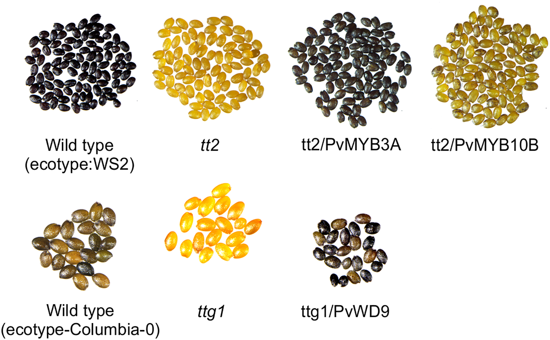 PvMYB3A and PvWD9 rescued Arabidopsis tt2 and ttg1 mutant phenotypes. Seeds of WS2, tt2 and tt2 transformed lines with PvMYB10B and PvMYB3A (top). Seeds of columbia-0, ttg1 and ttg1 transformed with PvWD9 (bottom). All seeds were stained in DMACA reagent for 36 h, washed in 70% ethanol and picture taken under light microscope.