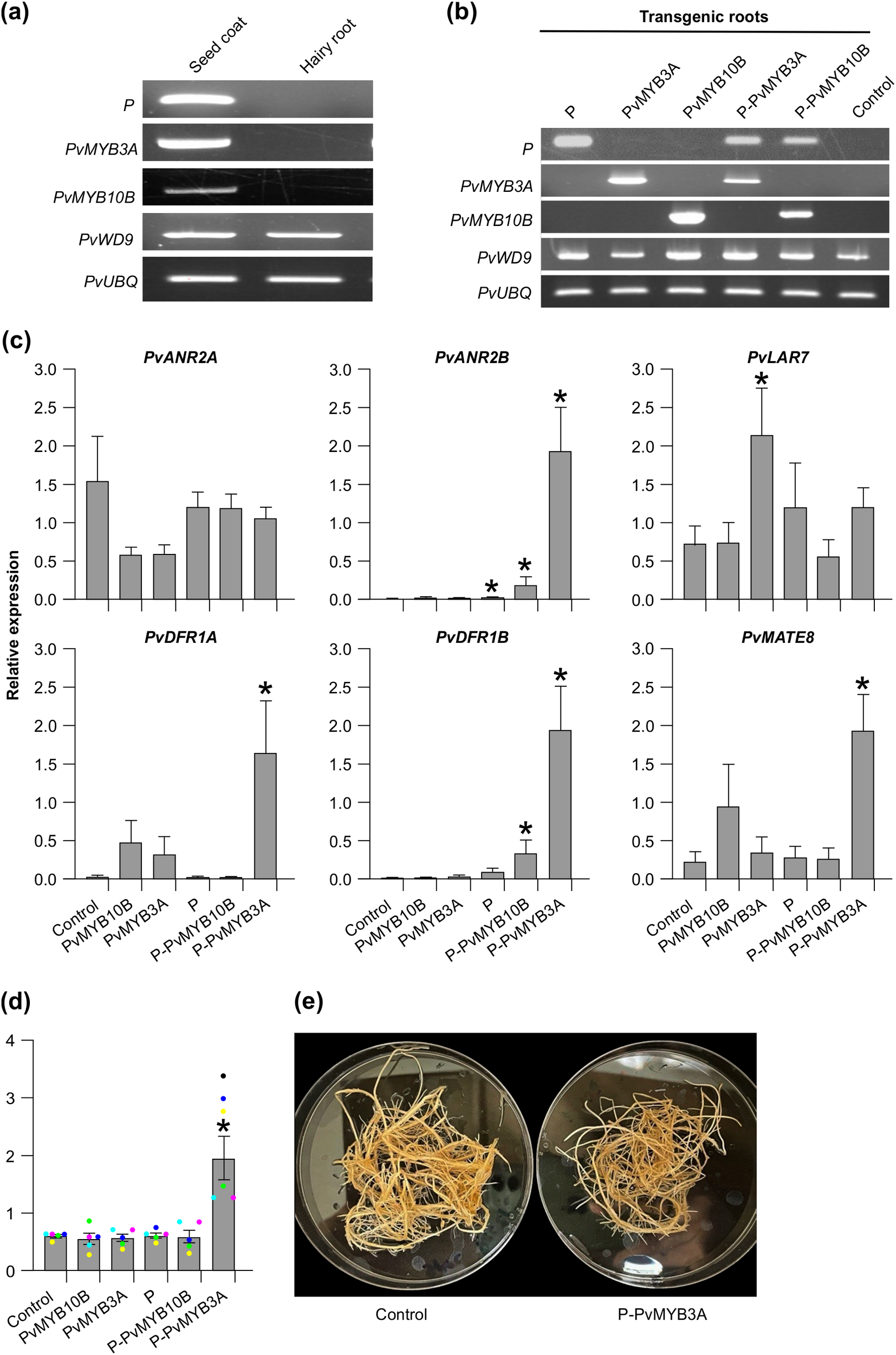 Transcript abundance and PA levels in the transgenic hairy roots of pinto bean. (a, b) RT-PCR showing expression of candidate MBW complex genes in seed coat and hairy root tissues of pinto bean cv CDC Pintium and confirmation of the transformation of respective hairy root lines with each of the constructs. P. vulgaris ubiquitin (PvUBQ) was used as reference gene control. (c) RT-qPCR was performed using gene-specific primers to check the expression of biosynthetic and transport gene candidates on each of the transgenic hairy root lines. Values were normalized with the reference gene PvUBQ. Empty vector transformed hairy root lines were used as control. Error bars indicate ± SEM (n=4, independent biological replicates and three technical replicates for each biological replicate). Asterisks (*) represent a significant difference compared to vector-only control as determined by Student’s t-test (p < 0.05). (d) Bars represent the total extractable PA levels expressed as proanthocyanidin A2 equivalents. Data represent the mean ± SE (n=5, independent biological replicates and three technical replicates for each biological replicate). Asterisks (*) represent a significant difference compared to control as determined by Student’s t-test (p < 0.05). (e) Images of P-PvMYB3A overexpressing transgenic and control hairy roots.