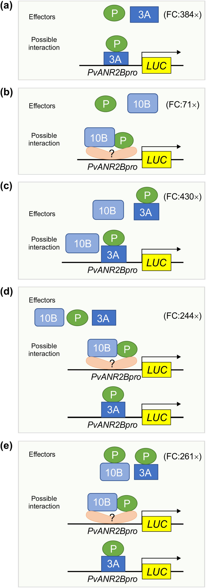 Proposed models showing the function of MBW complex partners for PvUNAR2B promoter driven gene activation. Based on the Y1H assay, only PvMYB3A (3A) but not P, and PvMYB10B (10B) binds with the PvANR2Bpro. Transient expression of LUC driven by the PvANR2Bpro demonstrated that P and 3A, either in combination as effectors (a) or as a fusion protein (c) can maximize LUC expression relative to the control, as shown by the fold change (FC). Despite the fact that 10B and P did not exhibit PvANR2Bpro binding ability, a 71-fold increase in LUC expression was seen (b) in comparison to the control, when they were utilized together as separate effectors. This suggests that 10B and P require the presence of co-factor(s) having DNA binding activity in order to stimulate gene expression. In the absence of P, 10B does not have significant effect on gene expression (c). Furthermore, P does not have any preferential interaction with 3A or 10B for PvANR2Bpro driven LUC expression (d, e).