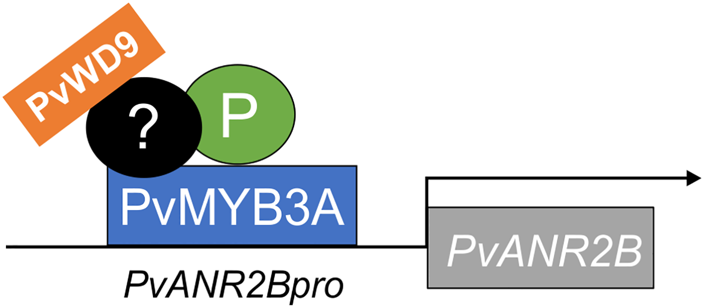 Infographic on PvANR2B gene activation by the MBW complex in pinto bean. P, PvMYB3A and PvWD9 along with additional factor(s) form a protein complex to activate late PA biosythetics genes (here, PvANR2B) thus regulating the synthesis and accumulation of PA in pinto bean seed coat. PvMYB3A only directly interacts with the gene promoter.