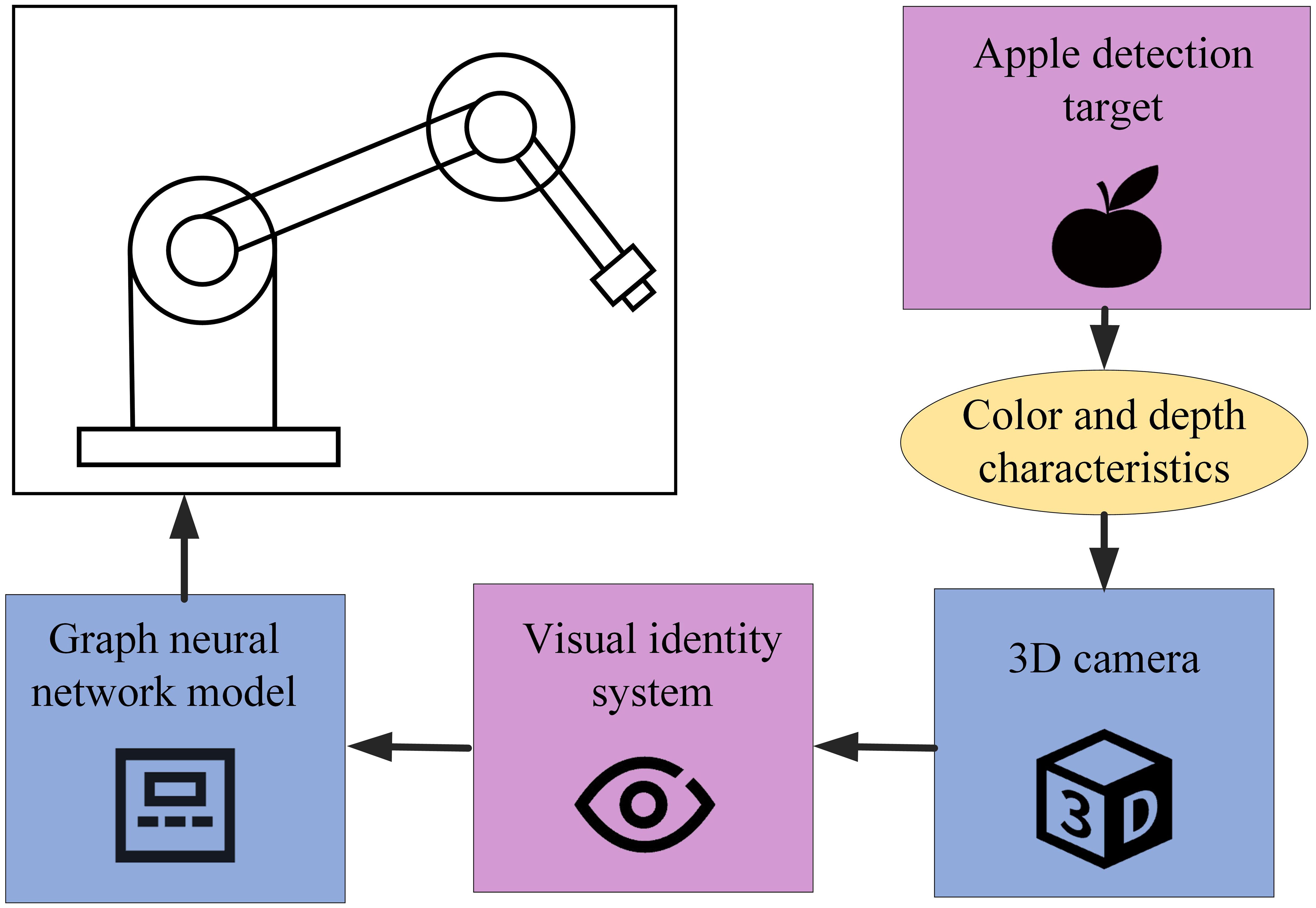 Figure 3. Schematic of the robotic apple detection system integrating a 3D camera, a visual identity module, and a graph neural network for precise recognition.