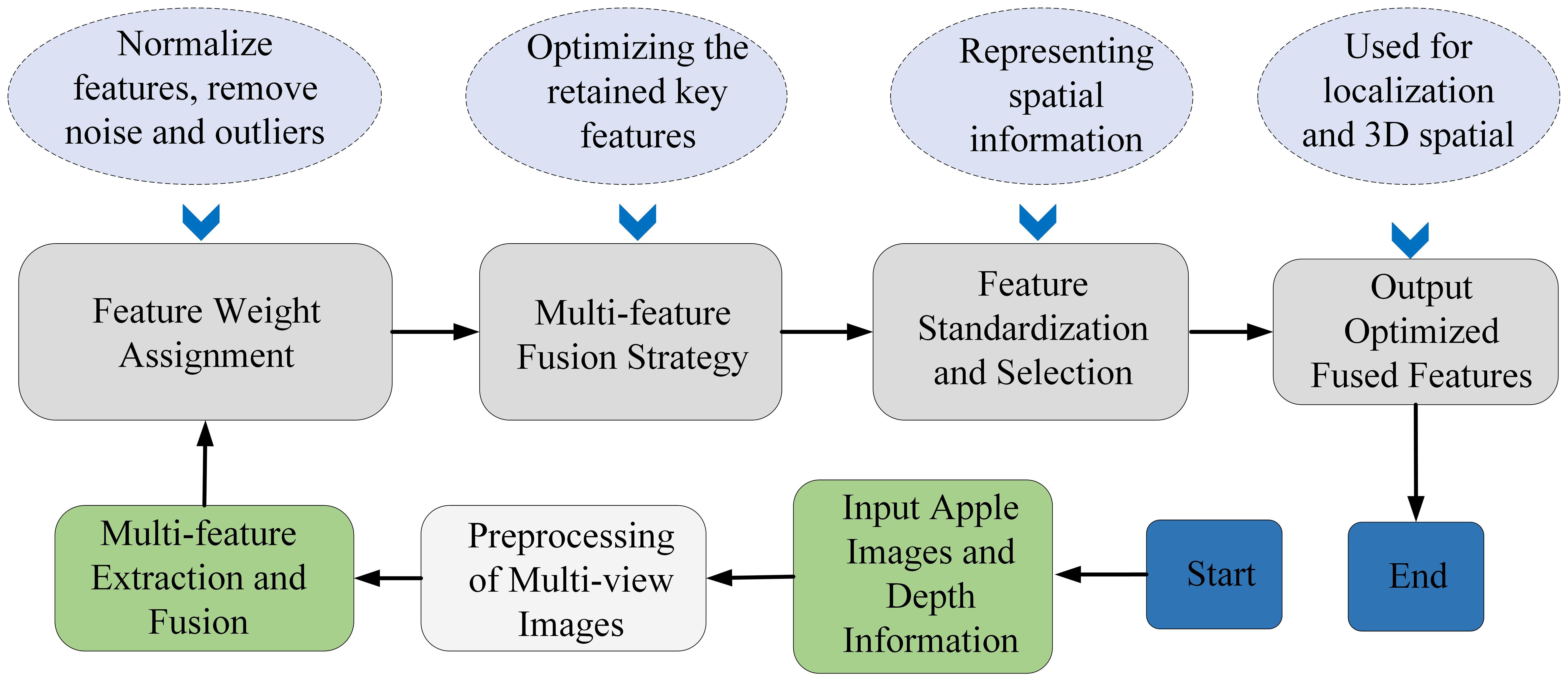 Figure 4 illustrates the multi-feature fusion approach for apple image analysis, which involves analyzing multiple pose features from apples and extracting essential features after bias removal to enhance centroid recognition and localization. We calculated the center of mass using the weighted average of pixel coordinates within the region, as described in Supplementary Equation 5. Internal and external camera parameters were calibrated using Supplementary Equation 6.