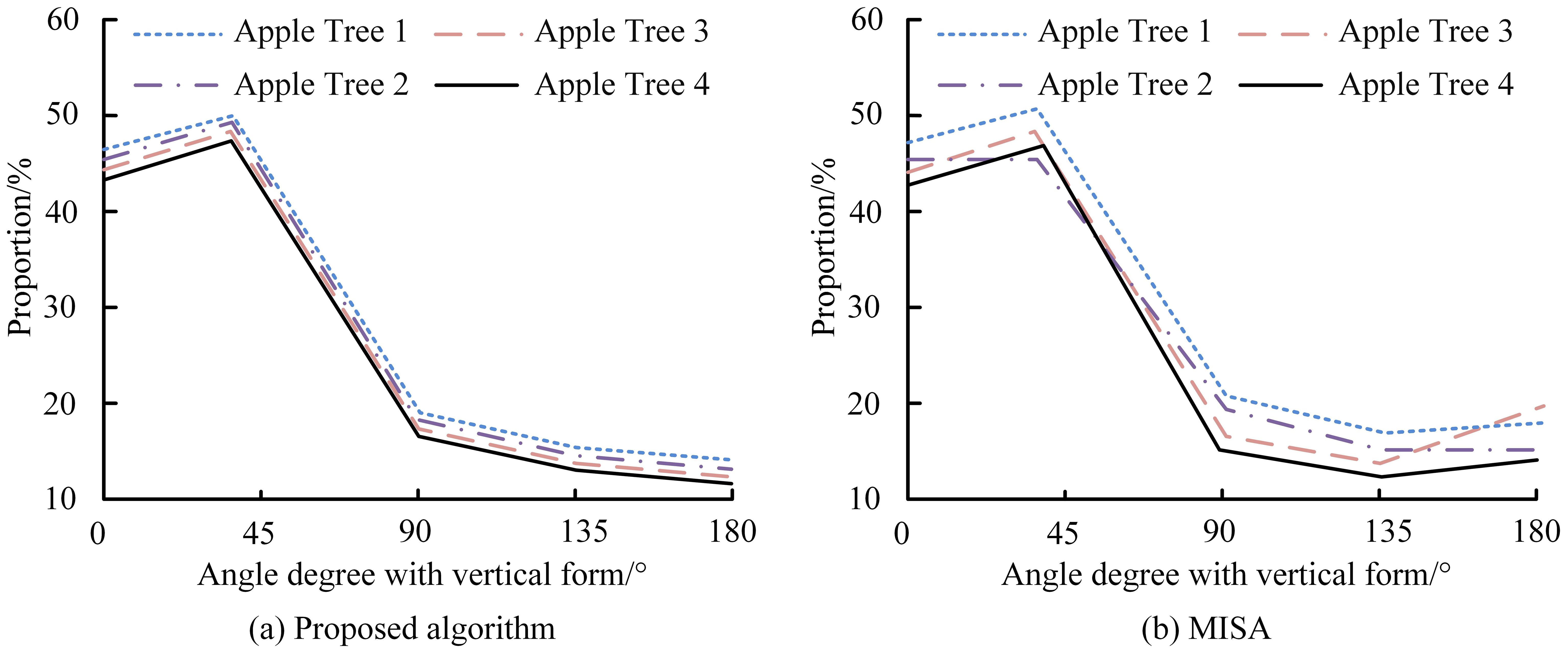 Depth estimation accuracy was further validated, achieving a maximum localization error of 0.97% across 800–1100 mm collection distances (Figure 8). Errors ranged from 0.4–0.65% at 800 mm and 0.4–0.5% at 1000 mm, with only slight increases to 0.73–0.79% at 1100 mm. All deviations remained below 1%, confirming high-precision depth estimation suitable for robotic harvesting applications. As shown in Figures 9A, B, the proposed algorithm outperformed MISA in detecting apple orientations on four trees at 0°, 45°, 90°, and 180°. It achieved the highest detection rate (> 40%) at 45°, while no apples were detected at 180°, where MISA showed greater variation and overlap, indicating reduced stability. Results for multiple algorithms at the 45° orientation are summarized in Table 1. The proposed method achieved the highest recognition accuracy (93%), correctly identifying 39 apples, followed by the CNN model (88%). The template-matching (TM) approach had the lowest accuracy (70%, 28 apples correctly identified).