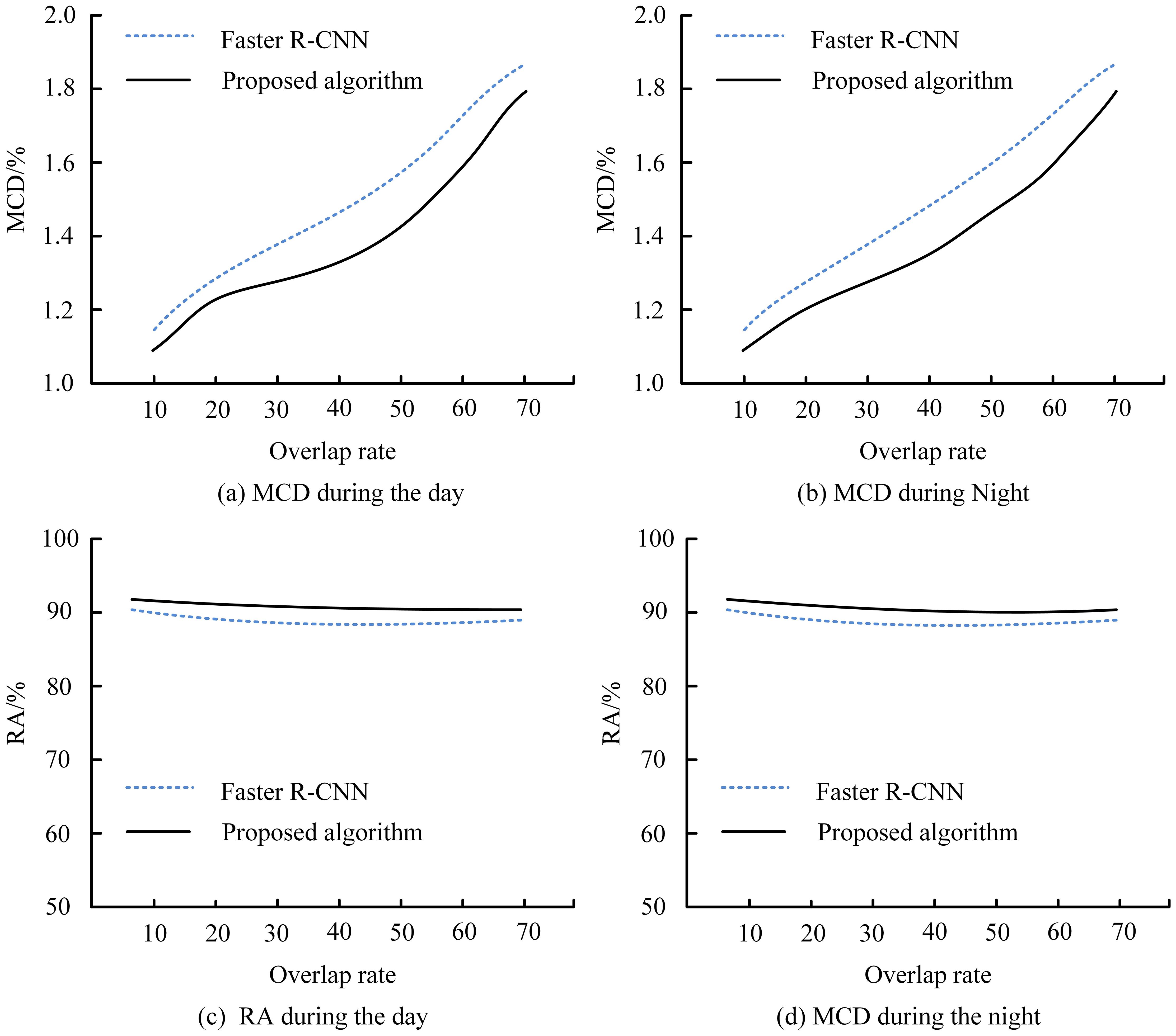 Figure 5. Detection accuracy (RA) and mean coordinate deviation (MCD) of the proposed clustering algorithm and Faster R-CNN under different overlap rates, illustrated for (a) MCD during the day, (b) MCD during the night, (c) RA during the day, and (d) RA during the night.