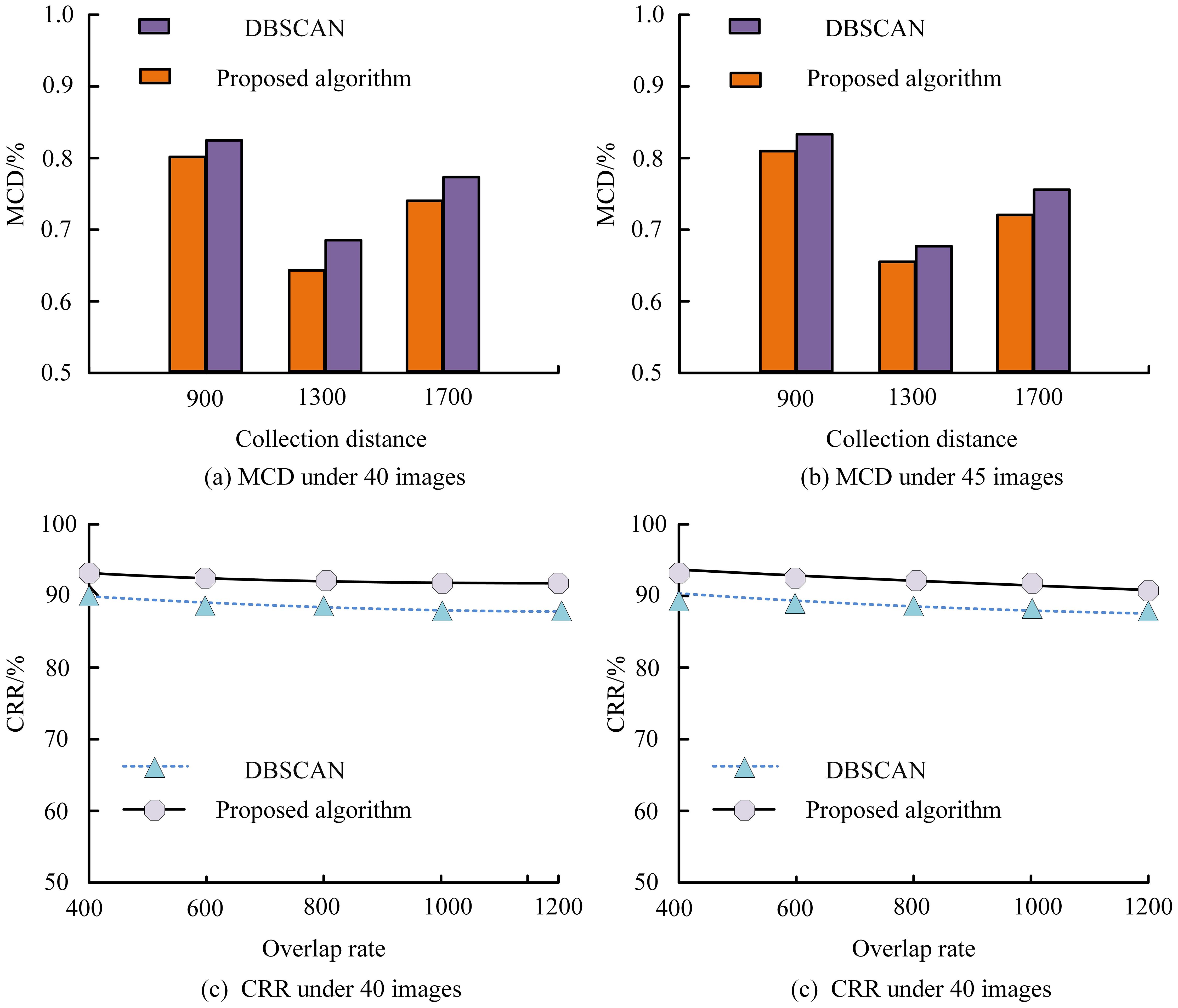 Figure 6. Comparison between the proposed algorithm and DBSCAN across different collection distances (900–1700 mm), shown for (a) MCD under 40 images, (b) MCD under 45 images, (c) CRR under 40 images, and (d) CRR under 45 images.