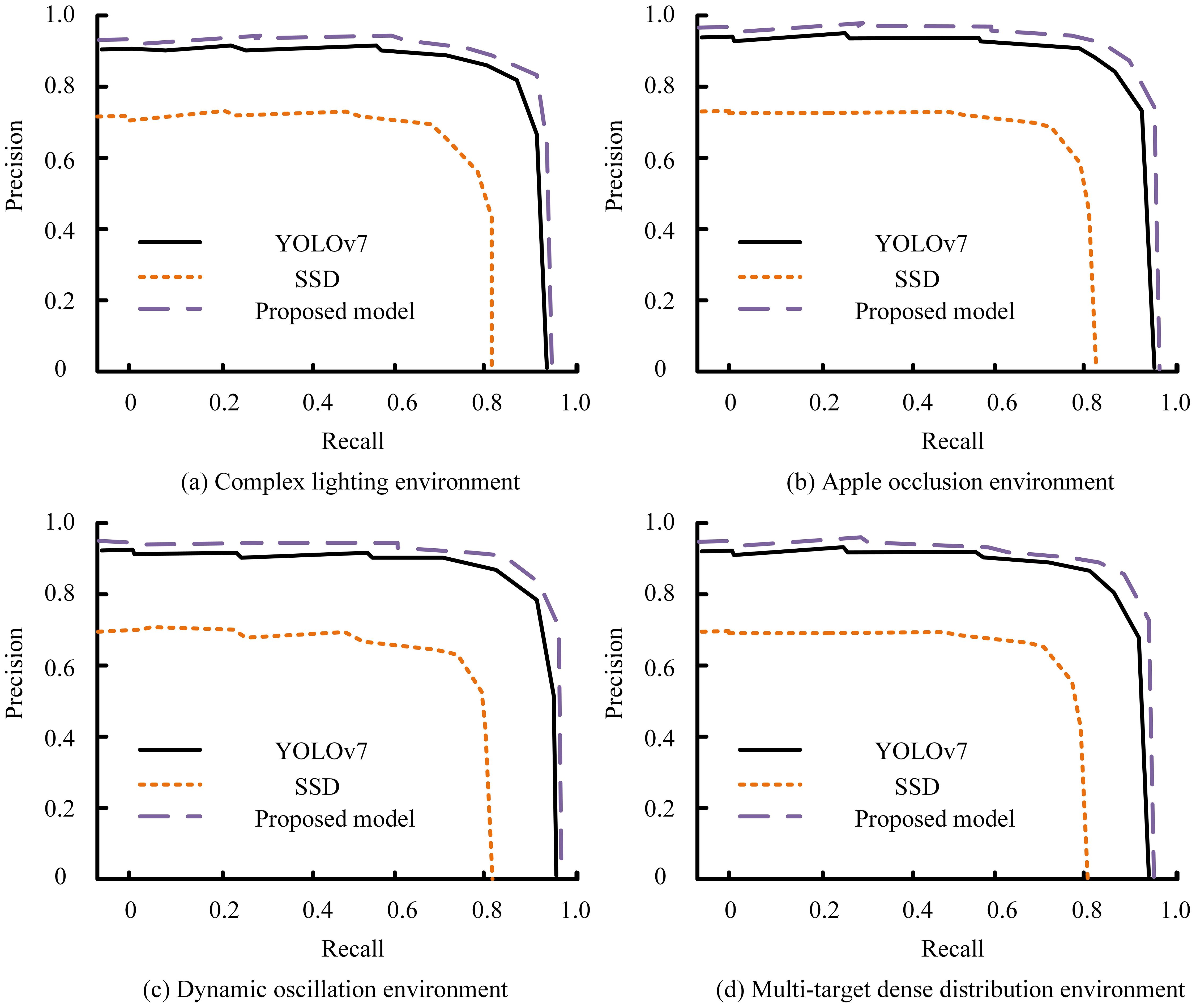 Figure 7. Precision–Recall comparison of YOLOv7, SSD, and the proposed model under different field conditions, including (a) complex lighting, (b) apple occlusion, (c) dynamic oscillation, and (d) multi-target dense distribution environments.
