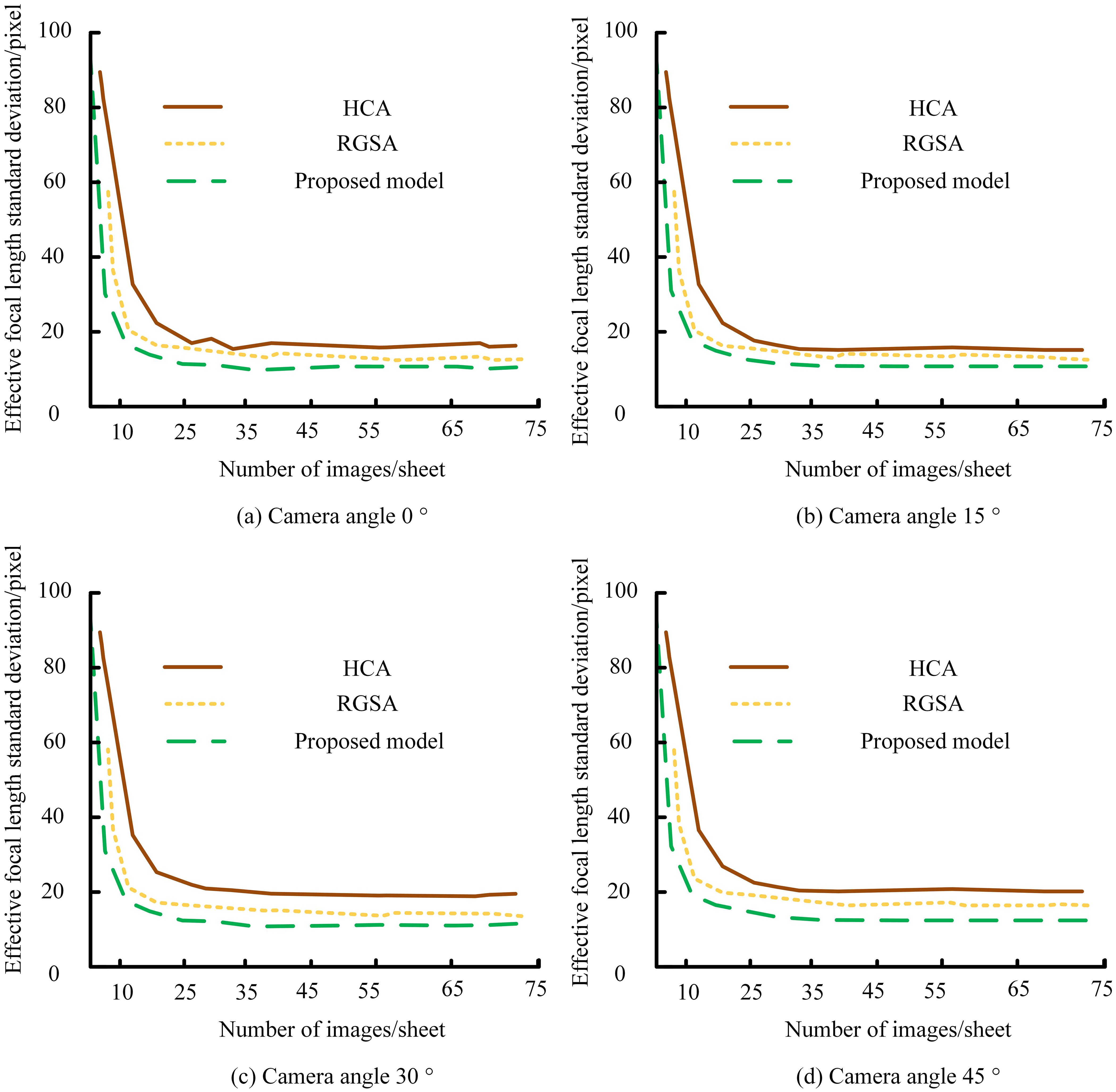 Figure 8. Effective focal-length standard deviation of the stereo vision system under different numbers of images per sheet, evaluated for (a) camera angle 0°, (b) camera angle 15°, (c) camera angle 30°, and (d) camera angle 45°, comparing the proposed model with HCA and RGSA.