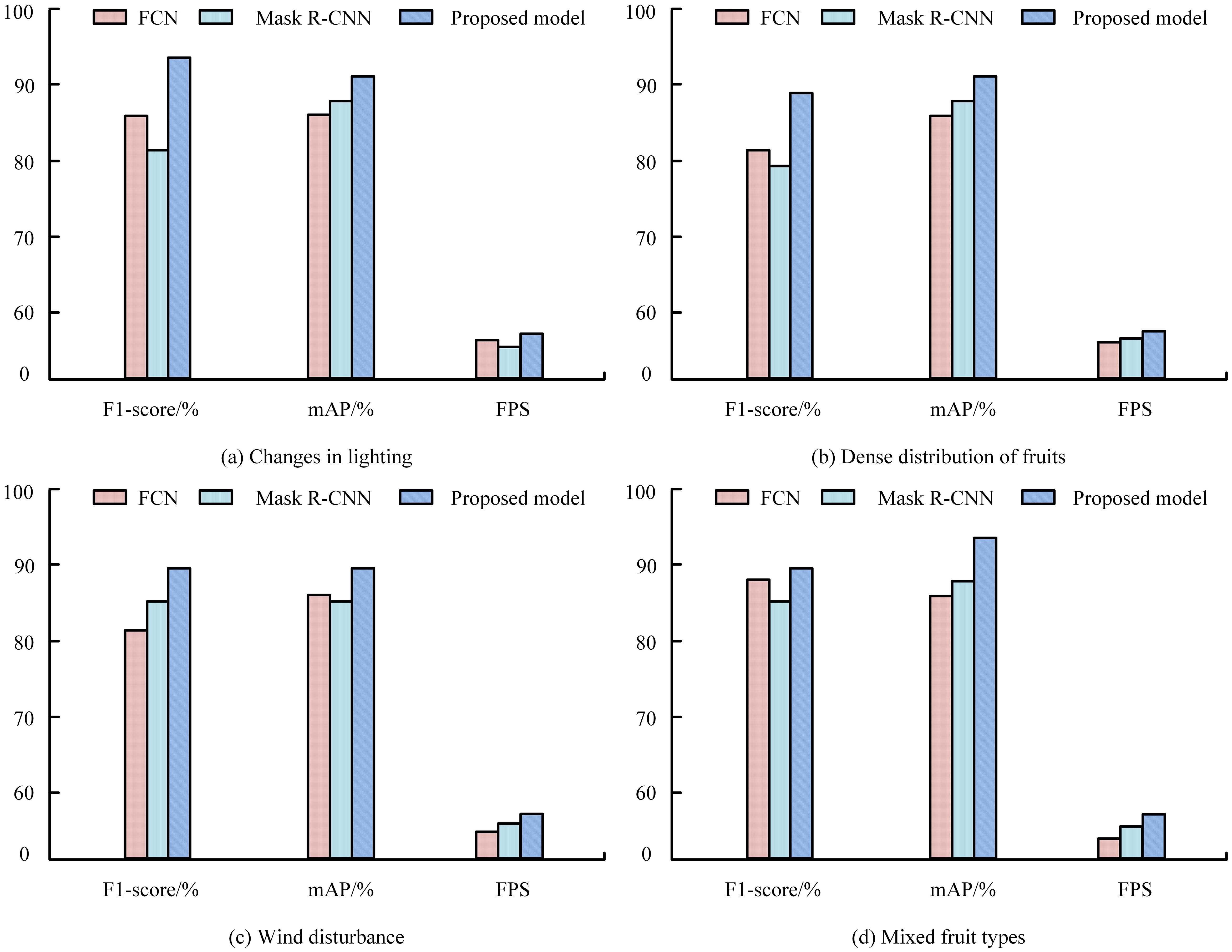Figure 9. Comparison of apple detection performance among FCN, Mask R-CNN, and the proposed model under different field conditions, including (a) changes in lighting, (b) dense fruit distribution, (c) wind disturbance, and (d) mixed fruit types, evaluated using F1-score, mAP, and FPS.