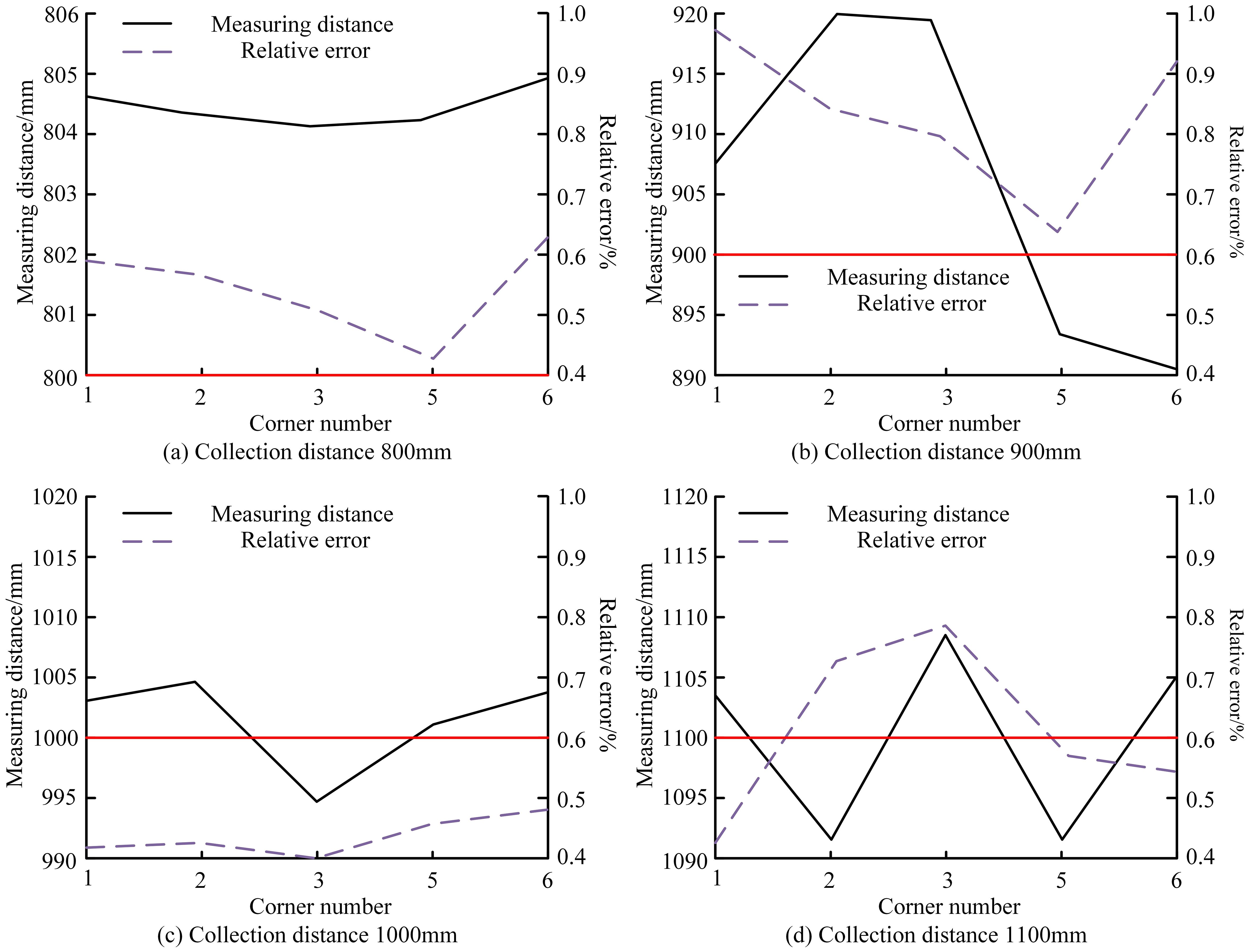 Figure 10. Measuring distance and relative error of the proposed stereo-vision depth estimation system across different collection distances, evaluated at (a) 800 mm, (b) 900 mm, (c) 1000 mm, and (d) 1100 mm, based on measurements from six corner points in the calibration board.