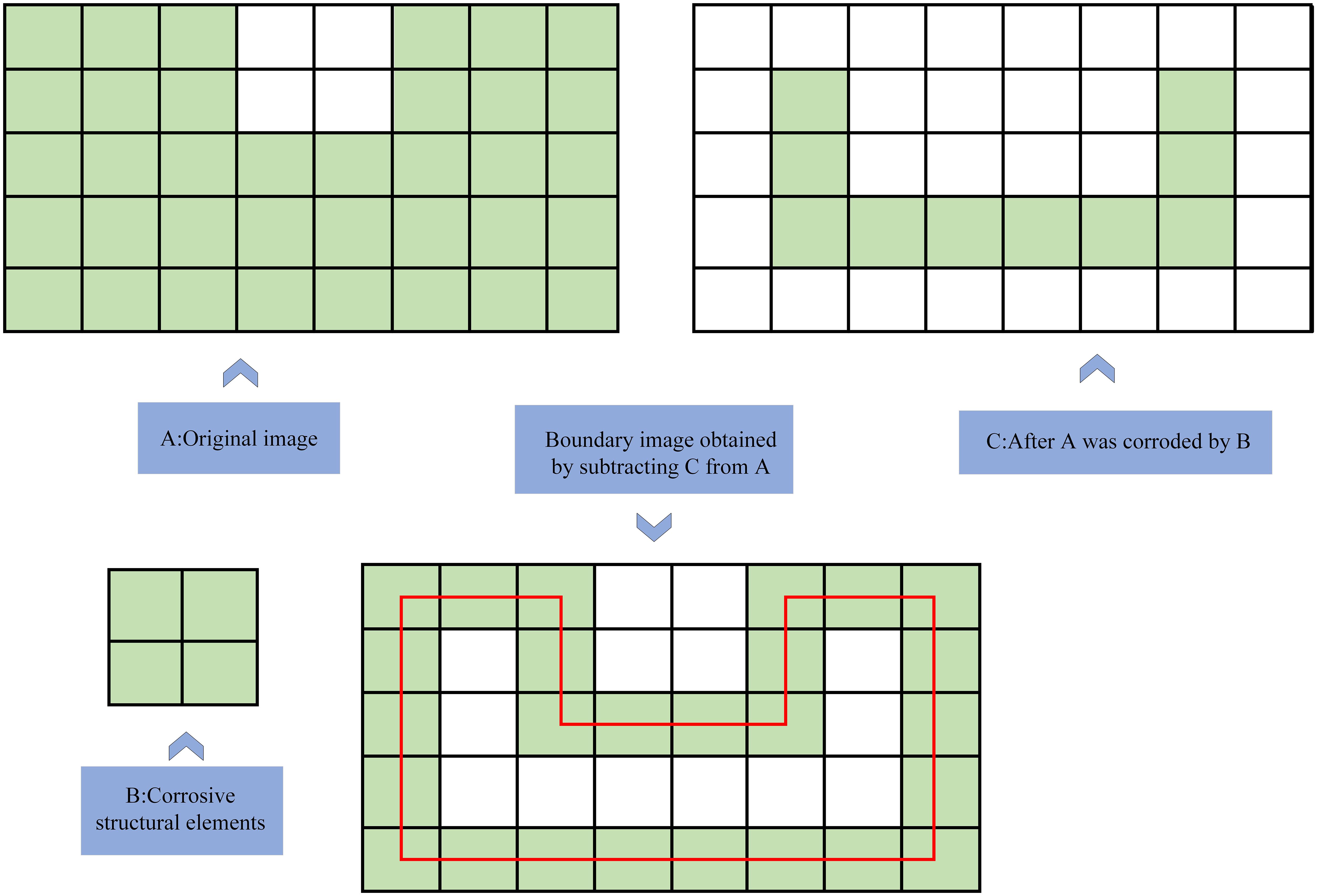 The segmentation results underwent morphological processing, eliminating small noise elements and restoring target edges (Supplementary Equation 3). Boundary extraction utilized erosion to isolate object edges, as shown in Figure 2. Connected region calculation was performed using Supplementary Equation 4 to obtain complete target information.