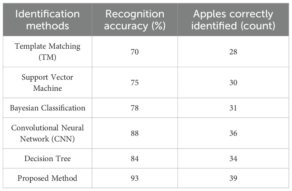The proposed method showed stable performance relative to MISA and achieved higher accuracy than CNN, TM, and other traditional classifiers, reflecting improved feature extraction and classification capability. Similar challenges in illumination and feature consistency were also noted by (Sun et al., 2021). Consistent results under varying field conditions confirm that the model can maintain real-time reliability in orchard operations. Previous studies using FCN reported fruit-counting accuracies of 0.91–0.95 and yield accuracies up to 0.98 (Häni et al., 2020), while Faster R-CNN achieved an F1-score of 0.89 and 91% mAP. In contrast, our model achieved higher mAP, F1-score, and frame rate, demonstrating superior detection in dense, multi-fruit environments. Real-world comparison with FCN and Mask R-CNN confirmed the proposed model’s superior accuracy and processing efficiency for dense, multi-fruit environments (Wan and Goudos, 2020; He et al., 2017). Compared to previous studies, Mask R-CNN performed poorly in our study, where the precision rate reached 97.31% and the recall rate reached 95.70% (Jia et al., 2020). These outcomes highlight its stability and real-time applicability under orchard conditions. Unlike deep-learning models that rely on large annotated datasets, the algorithm maintained strong performance with limited training images, reflecting better adaptability and lower data dependence (Koirala et al., 2019). Bargoti and Underwood found that 729 training images were necessary to stabilize AP for apple detection, but almond and mango models needed more data (Bargoti and Underwood, 2017). This study also demonstrated that data augmentation enabled better apple detection using only 100 images compared to 300 images without augmentation. Similarly, 93% of apples were accurately detected in 50 images despite uneven lighting conditions in a previous study (Xu and Lv, 2018). Compared to deep learning models like Faster R-CNN and YOLOv7, the proposed method requires less computational power and no extensive training, making it suitable for real-time applications on standard hardware. While sequential processing may limit scalability in large-scale deployments, this can be optimized with parallel computing. The pipeline’s reliance on generalizable features such as colour, texture, and morphology also makes it adaptable to other fruits or crops with minor adjustments. However, large-scale field validation and integration with robotic harvesting systems are still required to confirm performance under real operating conditions, which will be addressed in future development.