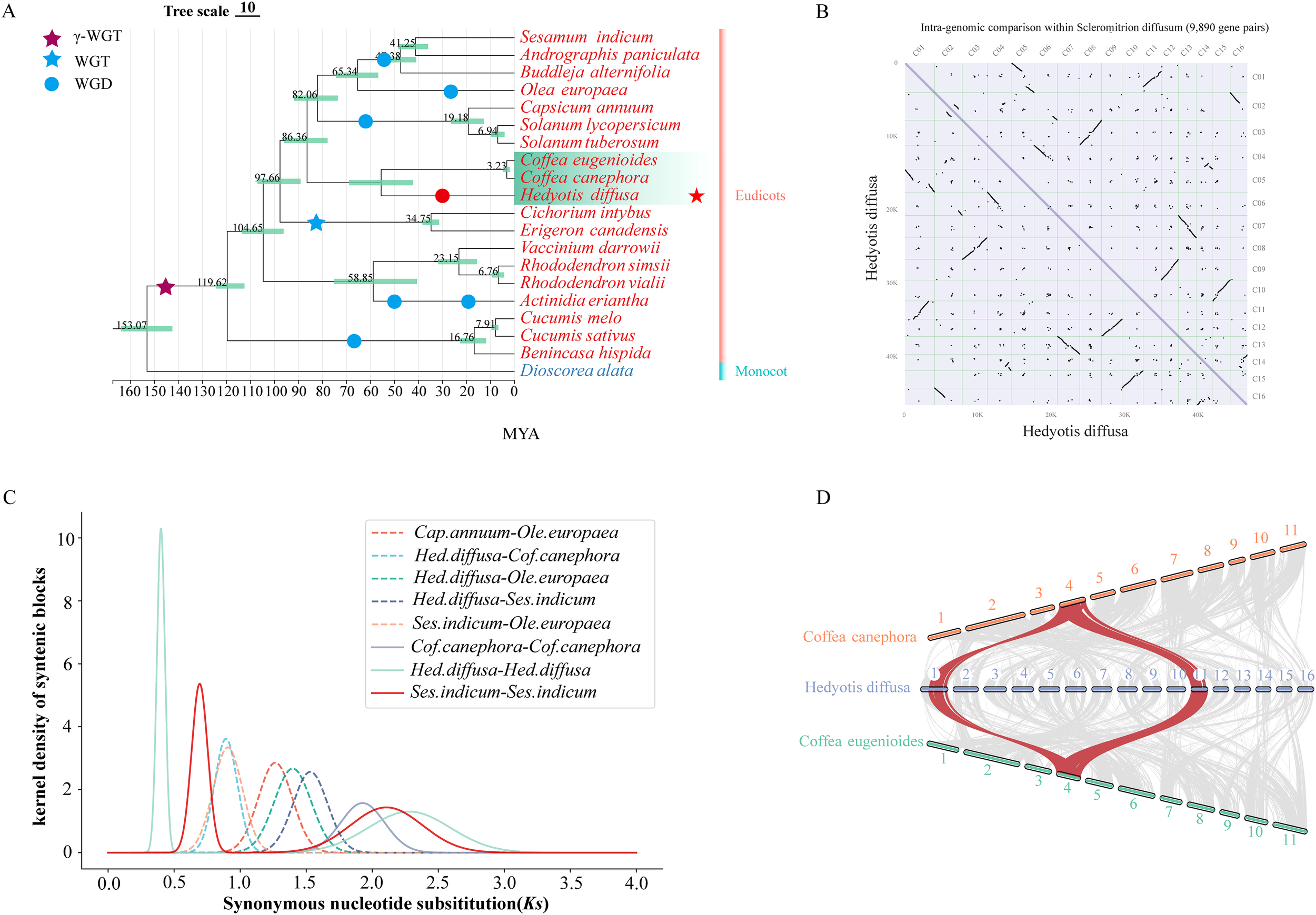 Phylogenetic and Comparative Genomic Studies. (A) Phylogenetic analysis of dicotyledonous plants with Hedyotis diffusa and other known genomic information. The evolutionary tree annotates the whole genome replication (WGD) events of known species and the estimated divergence time of each node; (B) Dotplot of synteny blocks within the Hedyotis diffusa genome, C01-C16 represents a grid of 16 chromosomes; (C) Distribution map of synonymous substitution rates (Ks) between Hedyotis diffusa and four other dicotyledonous species homologous gene pairs (D) The collinearity graph of Coffea and Hedyotis diffusa.